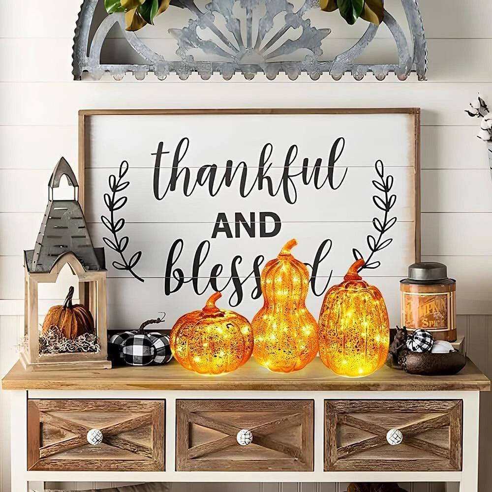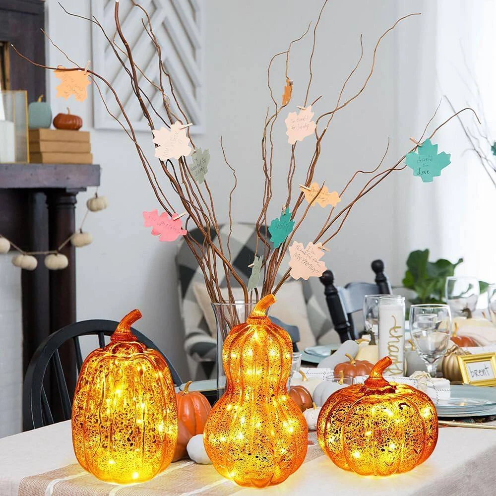 - Glass Craft & Design:Pumpkin-shaped glass decor with orange hue, silver lining, and speckled mercury glass finish; 12 copper wire lights emit warm glow, perfect for fall/Thanksgiving ambiance.