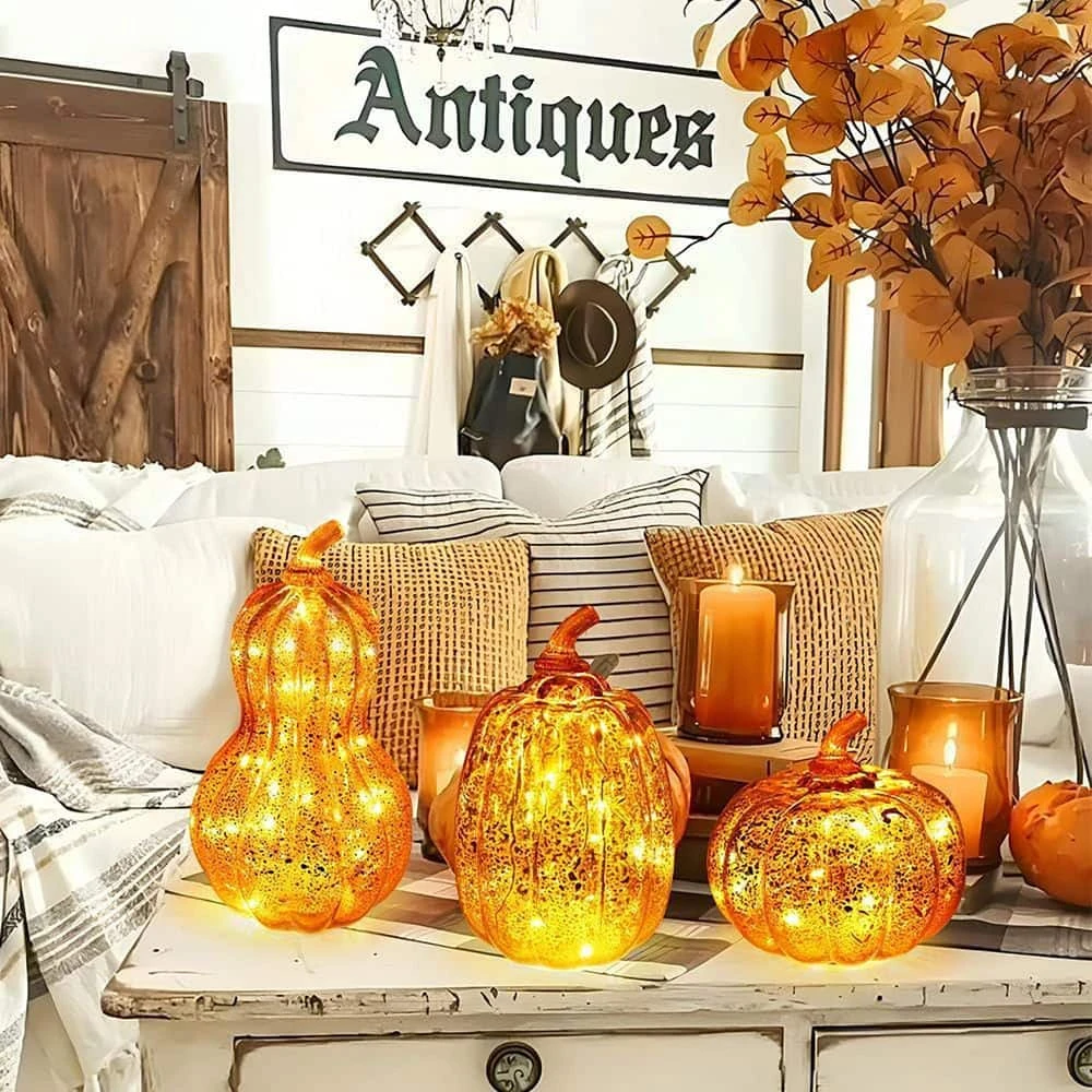 The Set of 3 Glass Pumpkin with LED Lights is designed as fall home decorations, featuring built-in timer functionality for convenient seasonal display. Ideal for Thanksgiving table centerpieces or indoor mantel decorating, these glass pumpkins emit warm illumination through LED lights, enhancing autumn-themed spaces with a festive glow. The set includes three pumpkins crafted from glass, suitable for creating cohesive fall decor in living areas, dining rooms, or other indoor settings.