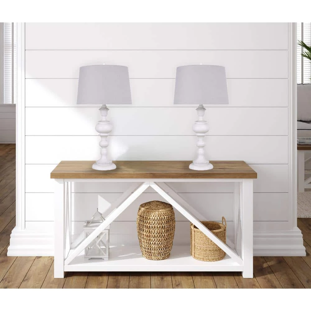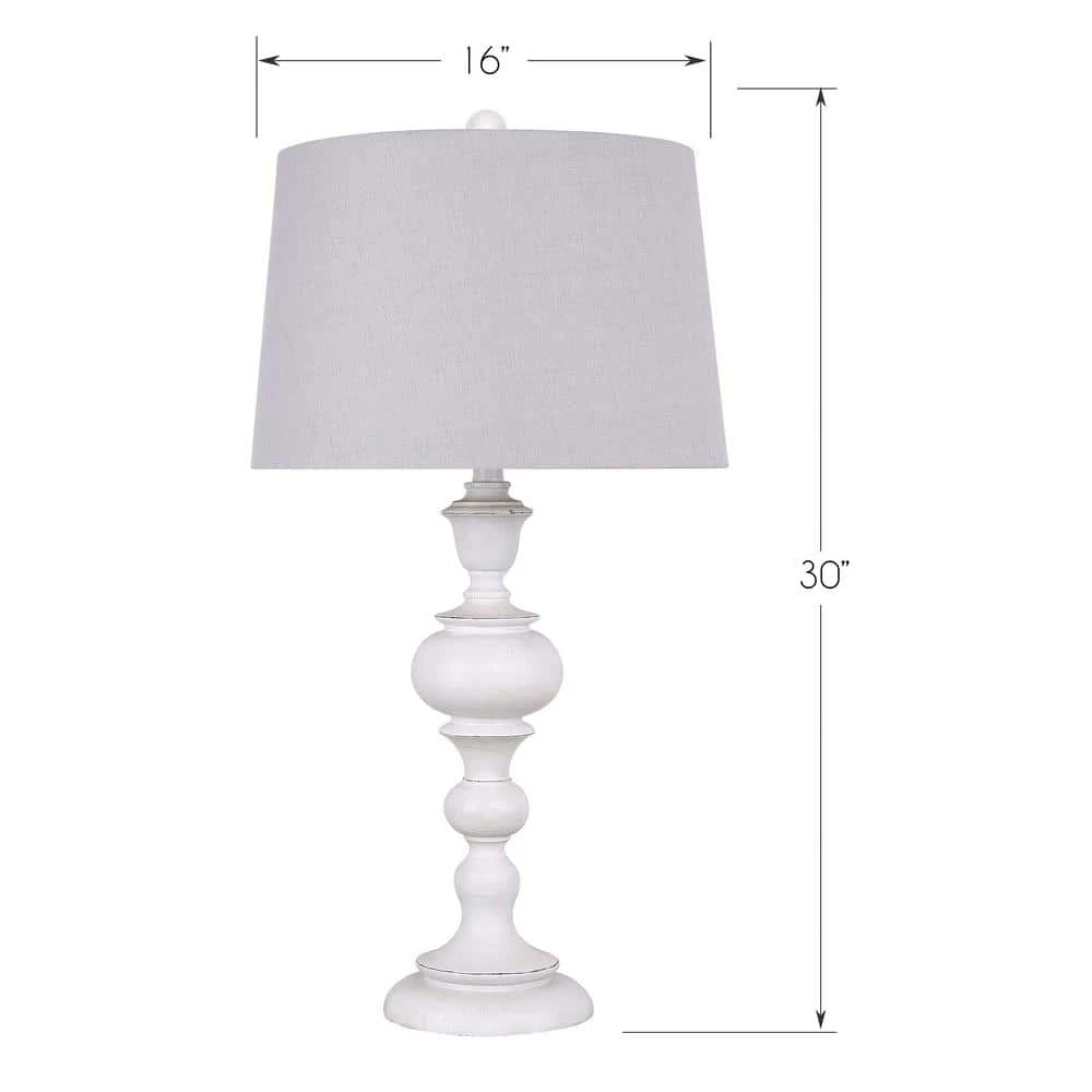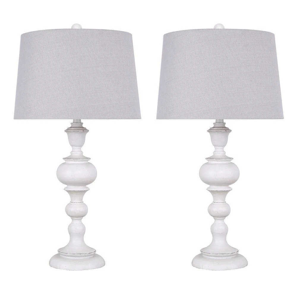 This beautiful set of polyresin table lamps by GRANDVIEW GALLERY features an attractive farmhouse chic look, complementing modern and reclaimed design elements. The round, tiered bodies have a beautiful distressed off-white finish, which has grey accents. Crowned by a tapered drum shade wrapped in soft grey, taupe linen fabric, these lamps’ neutral coloring will compliment any room. This pair is perfect for bedside tables, dressers or any space that you are looking to add some classic yet modern farmhouse style decor.