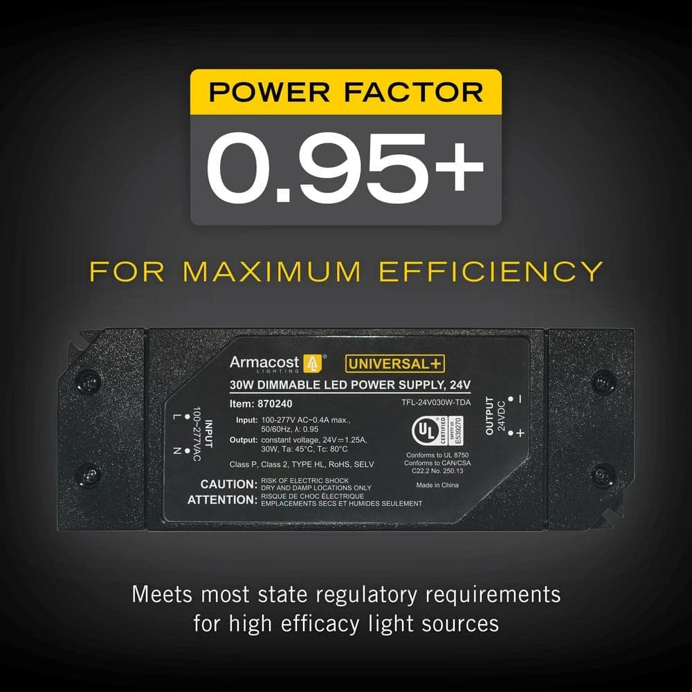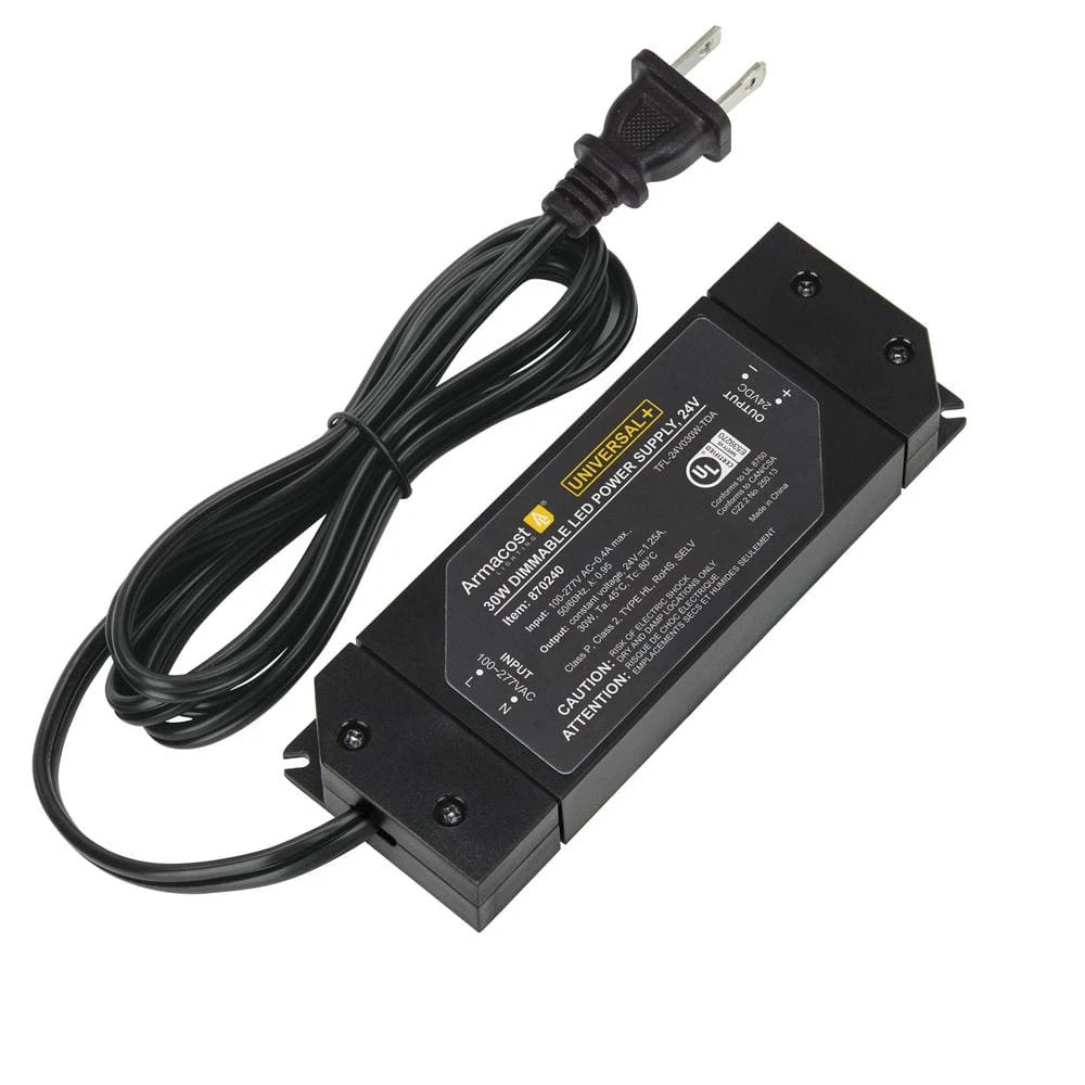 The 24-Volt Universal plus Dimming LED Power Supply features a high power factor and works equally well with TRIAC forward phase and ELV reverse phase dimming. The compact and lightweight driver delivers smooth, flicker-free dimming from 0% to 100% with no pop-on or pop-off. With a power factor or 0.95 plus, the highly efficient dimmable driver meets most state regulatory requirements. Ideal for new or upgrade undercabinet LED lighting projects. For the best results use Armacost Lighting LED lights, switches and dimming light controls. Plug-in or hardwire with detachable AC power cord. Suitable for both dry and damp locations. Includes 1 power supply and 1 detachable AC power cord.