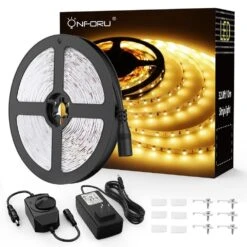 - You’ll get: 32.8 ft. /10 m LED strip, UL-certified power adapter, dimmer, some clips and some foam tape to hold the lights in place