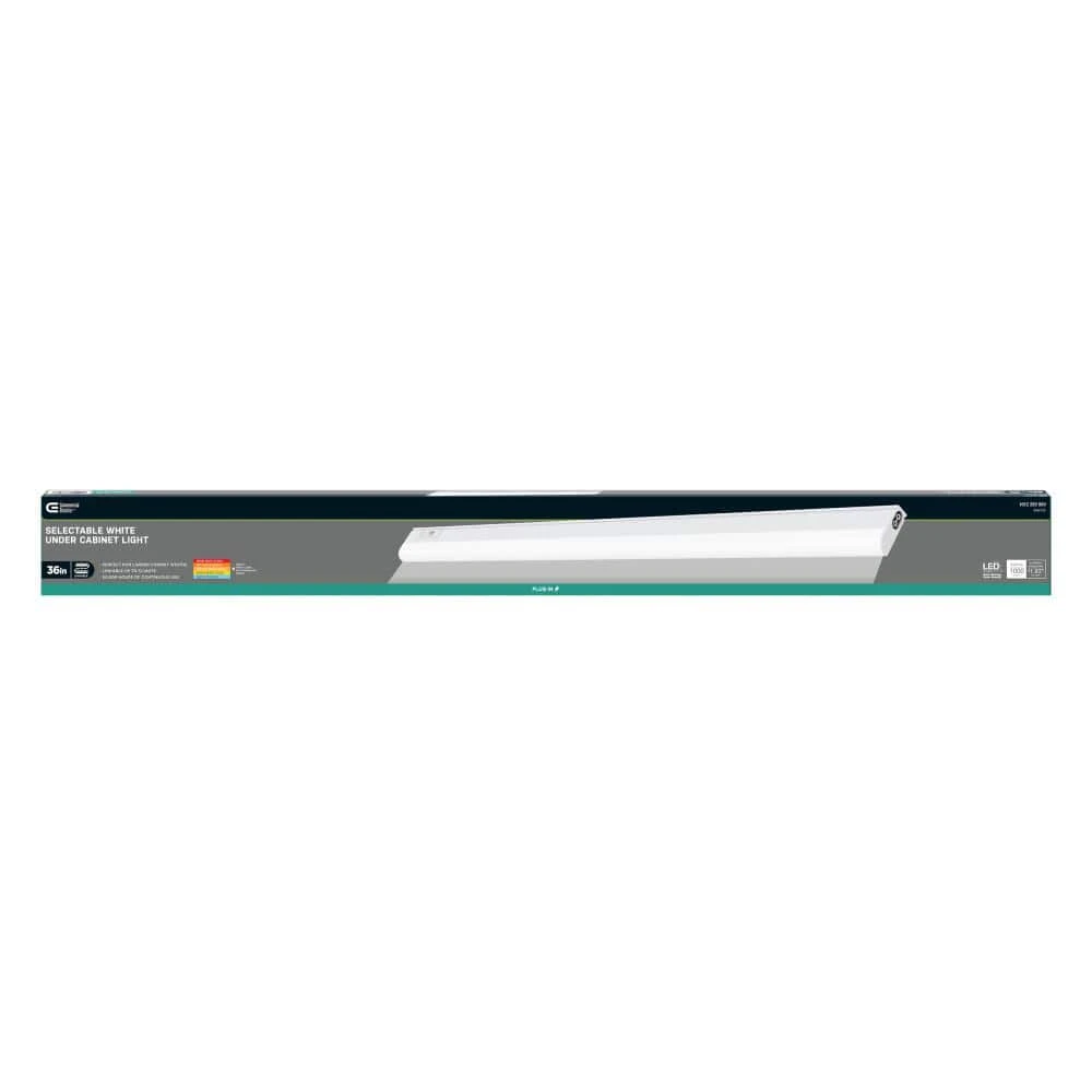 Upgrade your undercabinet lighting with the perfect solution for larger spaces, the Commercial Electric 36 in. Plug-In LED Undercabinet Light. This versatile light offers a variety of features to customize your kitchen or workspace. Easy slide switch allows you to choose from 5 color temperatures to customize your lighting for any task or mood. Select from 2700K, 3000K, 3500K, 4000K or 5000K, with High and Low dimming options at each color temperature (1000 Lumens max). The included end-to-end connectors and 15 in. linking cable allow for the connection of multiple lights together (up to 12 units) to span wider areas. Easy plug-in installation with a 5 ft. power cord eliminates the need for hardwiring. Replace older incandescent lighting with long-lasting LED light for up to 50,000-hours of bulb life and energy-efficient operation. It’s the perfect addition to kitchens, workshops, laundry rooms and anywhere you need additional task lighting or a touch of ambiance.