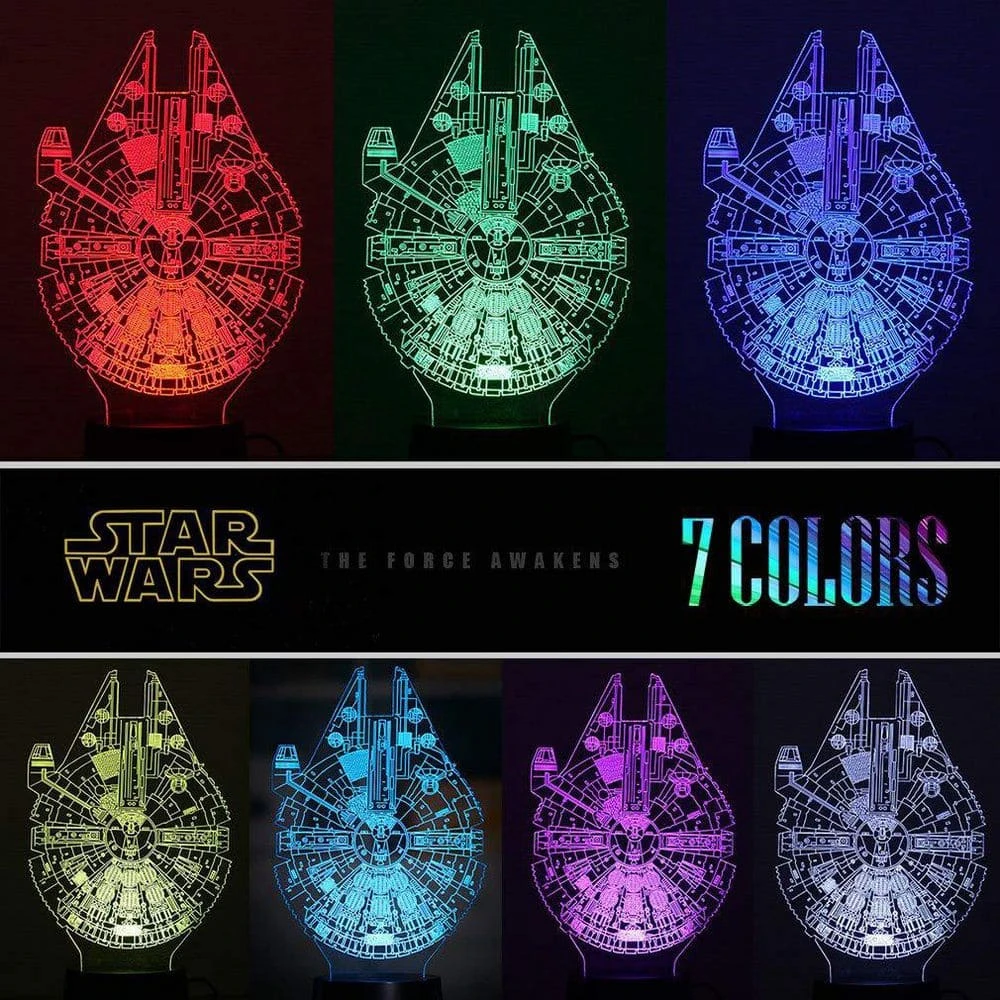 - Novel 3D lamp uses a laser – etched optical acrylic plate. With 10 LED uplights in the base, it projects a 3D Star Wars effect in the dark, illuminating the room and walls, creating a unique and cozy atmosphere.