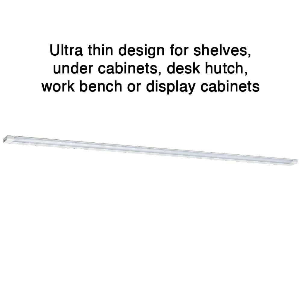 ETi 40in. Ultra-Thin Magnetic LED Linkable Under Cabinet Shelf Light has an installed profile height of 0.6in. to easily blend into most applications. Connect multiple fixtures with the included linking cable to allow all your fixtures to be powered and controlled from a single switch while minimizing cord clutter. A maximum of 10 fixtures can be linked creating functional and aesthetically pleasing in a variety of spaces. Installation is extremely simple using either the magnetic attachment or screws. This fixture delivers 1000 lumens of brightness producing extremely uniform ambient 5000K illumination. With its long-lasting service, our linkable Magnetic Shelf Light is maintenance free with no bulbs to replace. Great for office cubicle cabinets, retail & grocery store, gondola shelving, boutiques, restaurants, pantry or food storage areas, laundry room shelves and more.