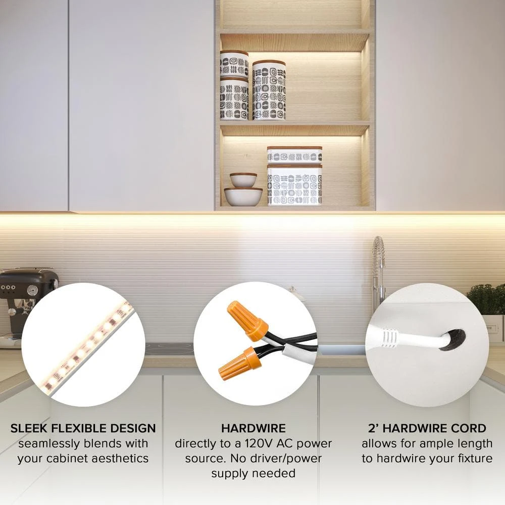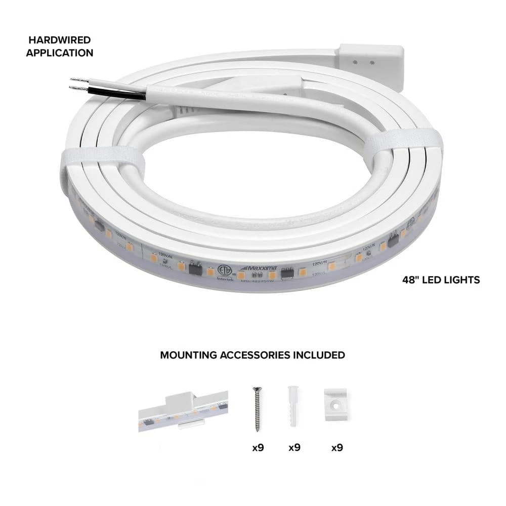 This cutting-edge 48 in. under-cabinet LED strip light fixture is designed to illuminate your space with unparalleled brilliance. This energy-efficient cove light can be easily mounted with the included screws and mounting clips to any desired surface, including cabinets, counters, bathrooms, pantries, closets, crown molding or any area where task lighting is essential. This light is also rated for outdoor use when installed in a weatherproof j-box with GFCI breaker. This unique strip light is easy to install, wiring directly to your 120-Volt AC power source, with no driver or power supply needed. The 2 ft. cord allows for ample length to hardwire your fixture ensuring a stable and permanent installation to deliver consistent and reliable illumination for years. With an impressive 1840 Lumens of radiant 3000K warm white light, this under counter light adds the perfect accent lighting to your space while using only 24-Watt of energy. Its compact, low-profile sleek design of only 0.26 in. D seamlessly integrated into your cabinetry, providing discreet and modern lighting solutions. Experience the perfect blend of functionality and aesthetics as you transform your environment with this high-performance lighting solution. This under cabinet light fixture is ETL Listed and is backed by Maxima for 3-years.
