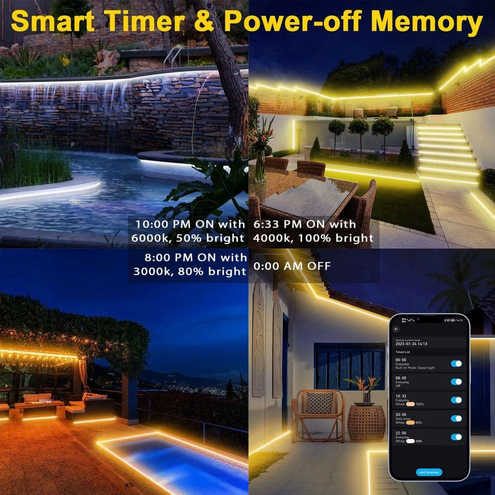 - Dimmable and adjustable color temperature: the waterproof light rope is extremely bright, with a high density of 120-LEDs (warm and cold white) per meter, the 50 ft. or 100 ft. outdoor white LED strip is dimmable, and its color temperature can be adjusted from 3000 K to 6500 K, this allows users to change the lighting to suit different occasions, like parties, dinners, or family gatherings