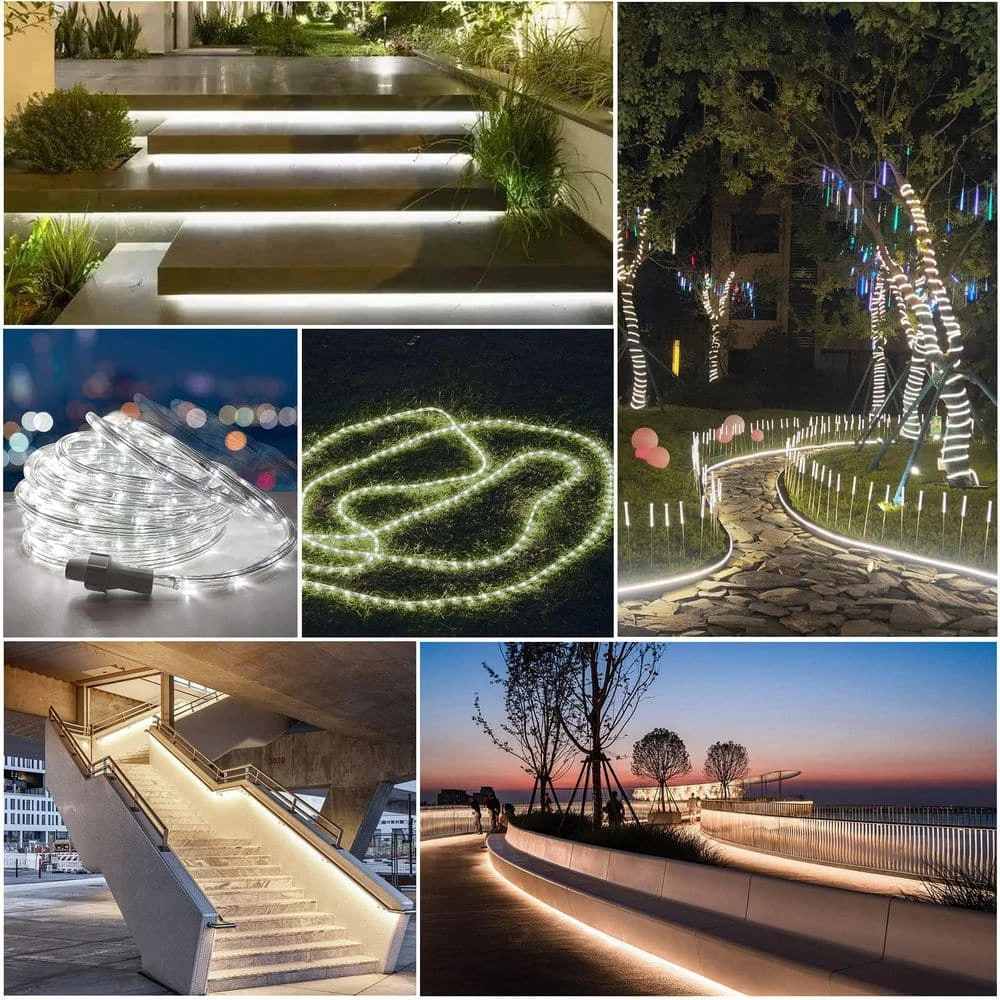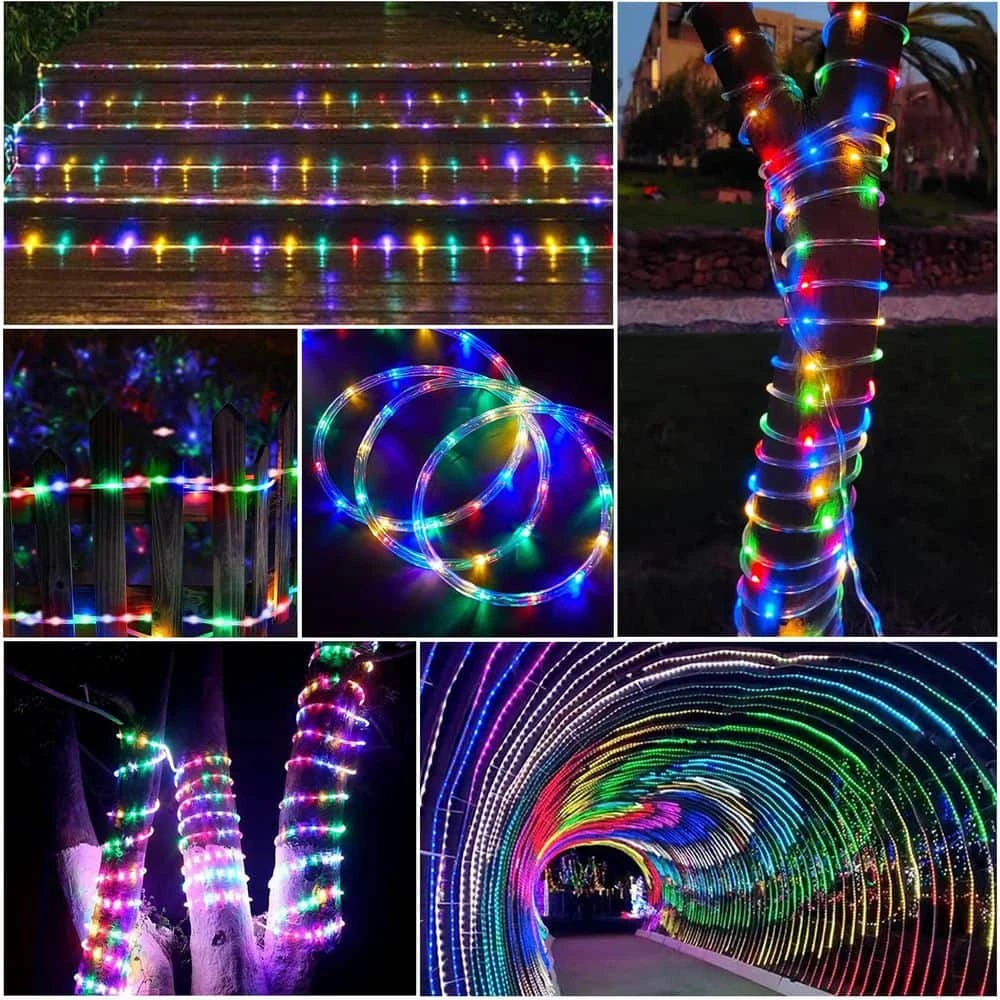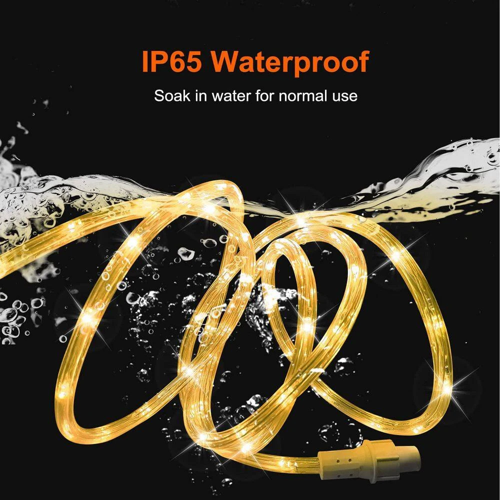 16-color changing rope lights with 8 dazzling modes! IP68 waterproof clear tubing provides superior outdoor durability. Includes remote for color selection, mode changes and 6-18hr timer. Bendable design wraps easily around trees and patio features.