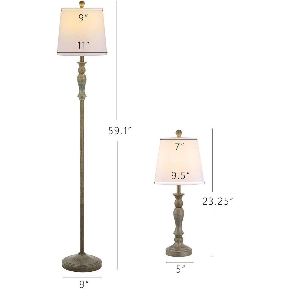 - Floor lamp: fully assembled 59 in. H, 9 in. W, widest portion of the lampshade is 11 in. Dia table lamps: fully assembled 23 in. H, 5 in. W, widest portion of the lampshade is 9 in. Dia