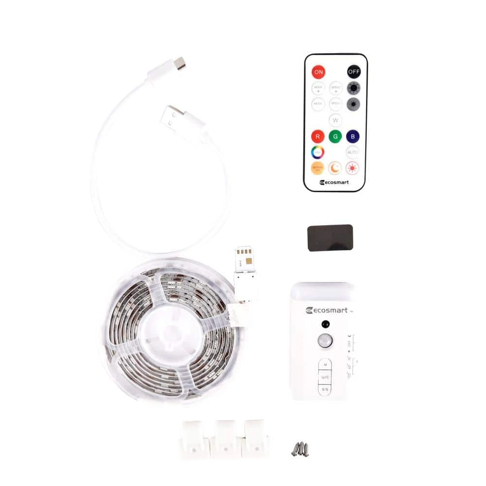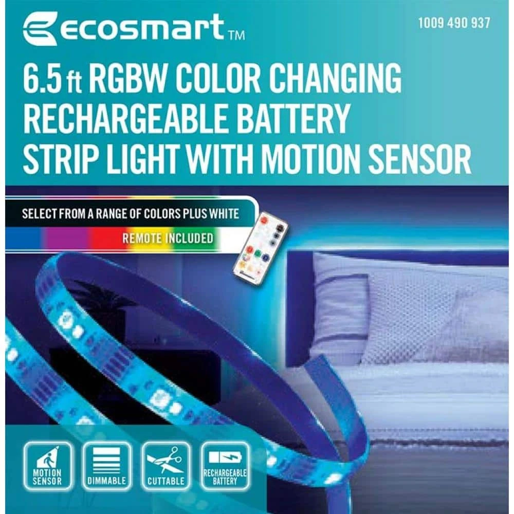 Light up any room in your home with a 6.5 ft. flexible LED RGBW Motion Rechargeable Light Strip. The motion sensor LED strip lights can sense you coming and automatically turn off when it no longer detects motion. Light the way up the stairs, under the kitchen or bathroom cabinets, or simply add RGBW color to any room in your home. Use the included 17 key remote control to choose from 8 preset LED colors and 5 effects modes. The flexible strip light allows you to easily cut the strip to your desired length and mount on any surface in your home with the sticky backing. The lights are USB powered so you don’t have to worry about extra-cords or plugging into a wall outlet for power, just plug in the USB and you are ready to go.