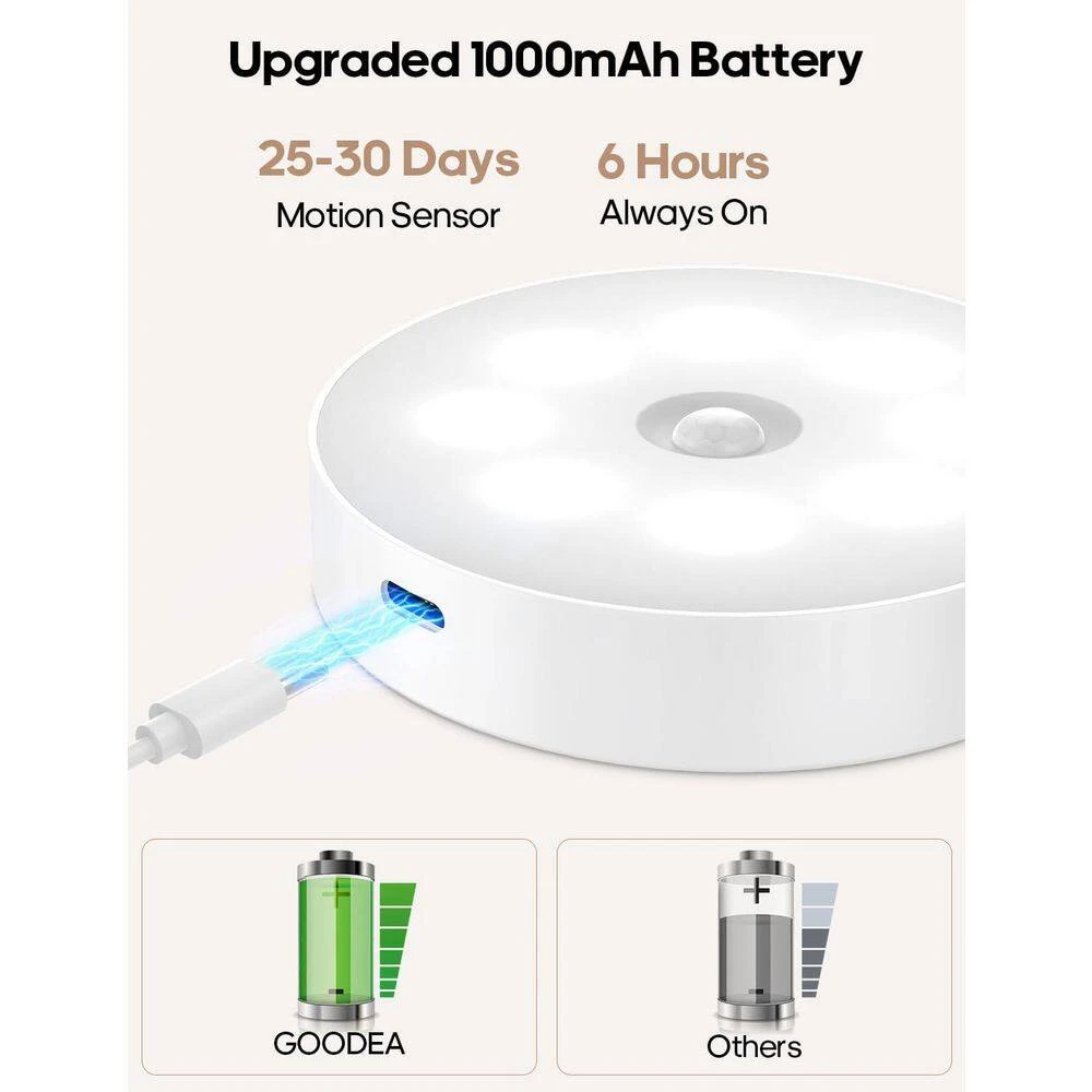 - Equipped with a 1000mah lithium battery, these USB-rechargeable puck lights last up to 6 hours on max brightness or 30-60 days in motion sensor mode on a single charge, reducing battery waste and saving energy