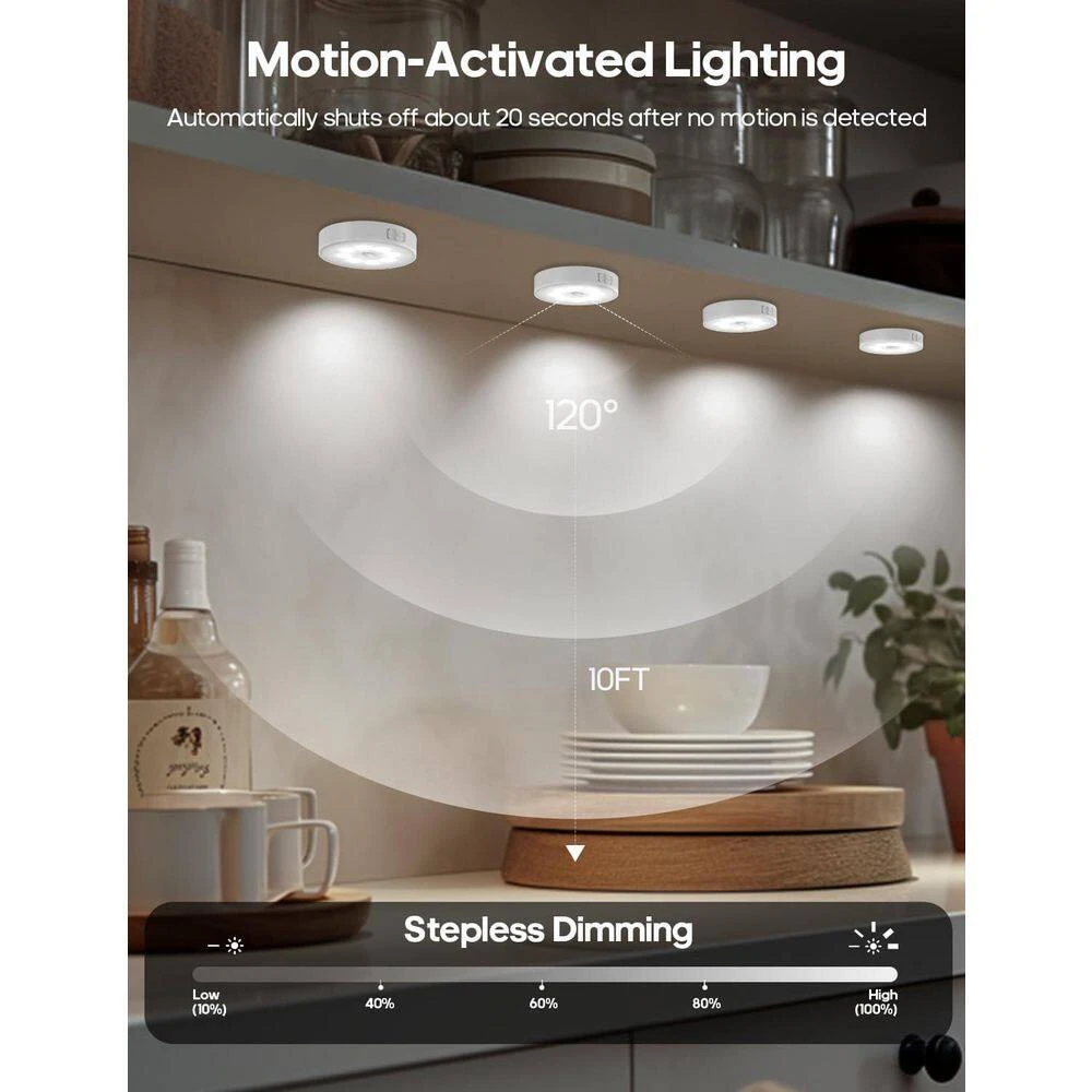 Upgrade your home lighting with these motion-activated rechargeable LED puck lights, designed for kitchens, cabinets, closets, stairs, and more. With adjustable brightness, a built-in timer, and easy installation, these under-counter lights provide the perfect balance of convenience, efficiency, and style.Illuminate your home with these smart, motion-activated LED under-cabinet lights, offering customizable brightness, energy efficiency, and effortless installation for a modern and convenient lighting solution.