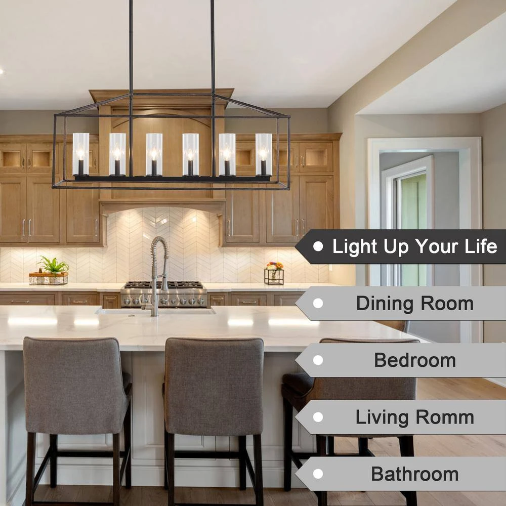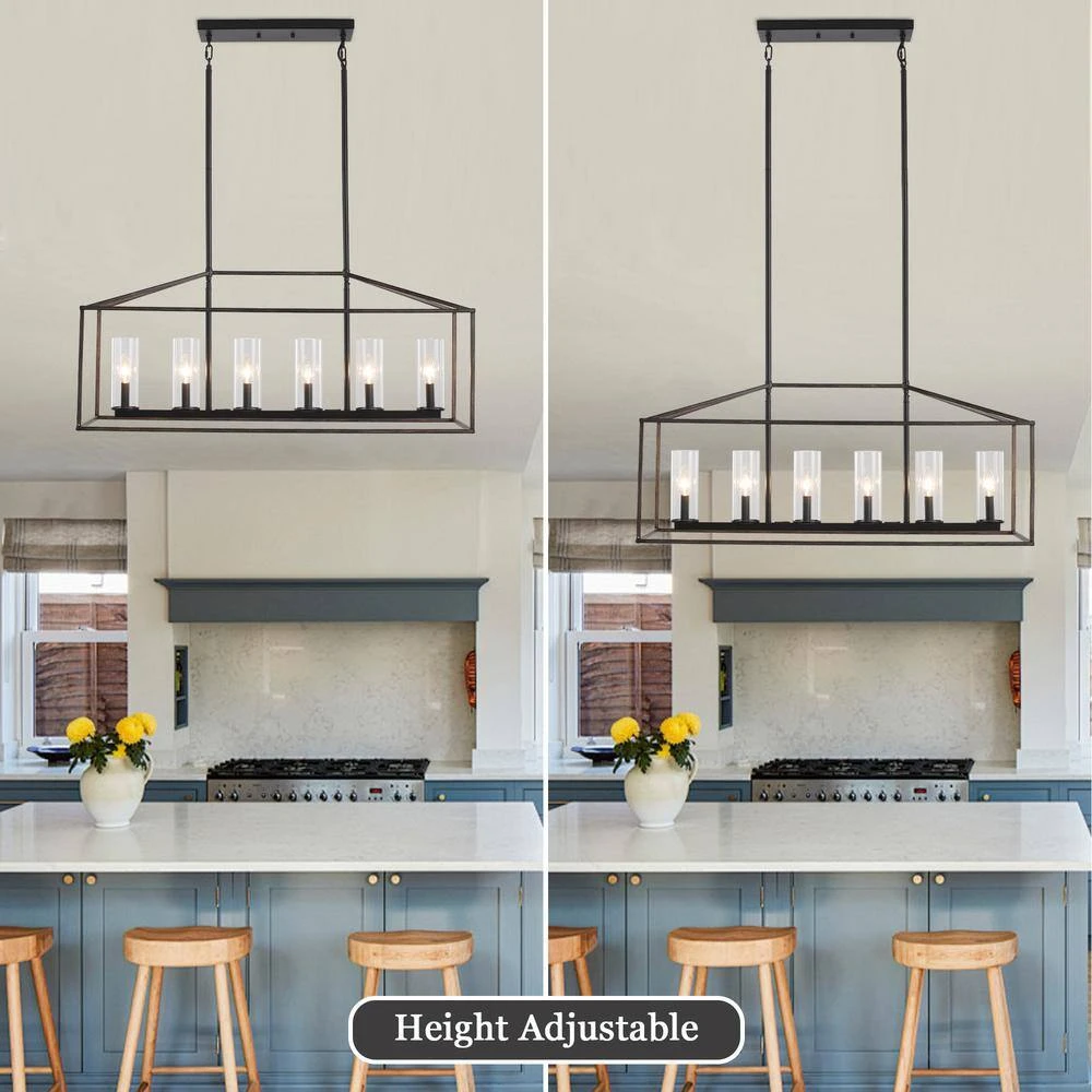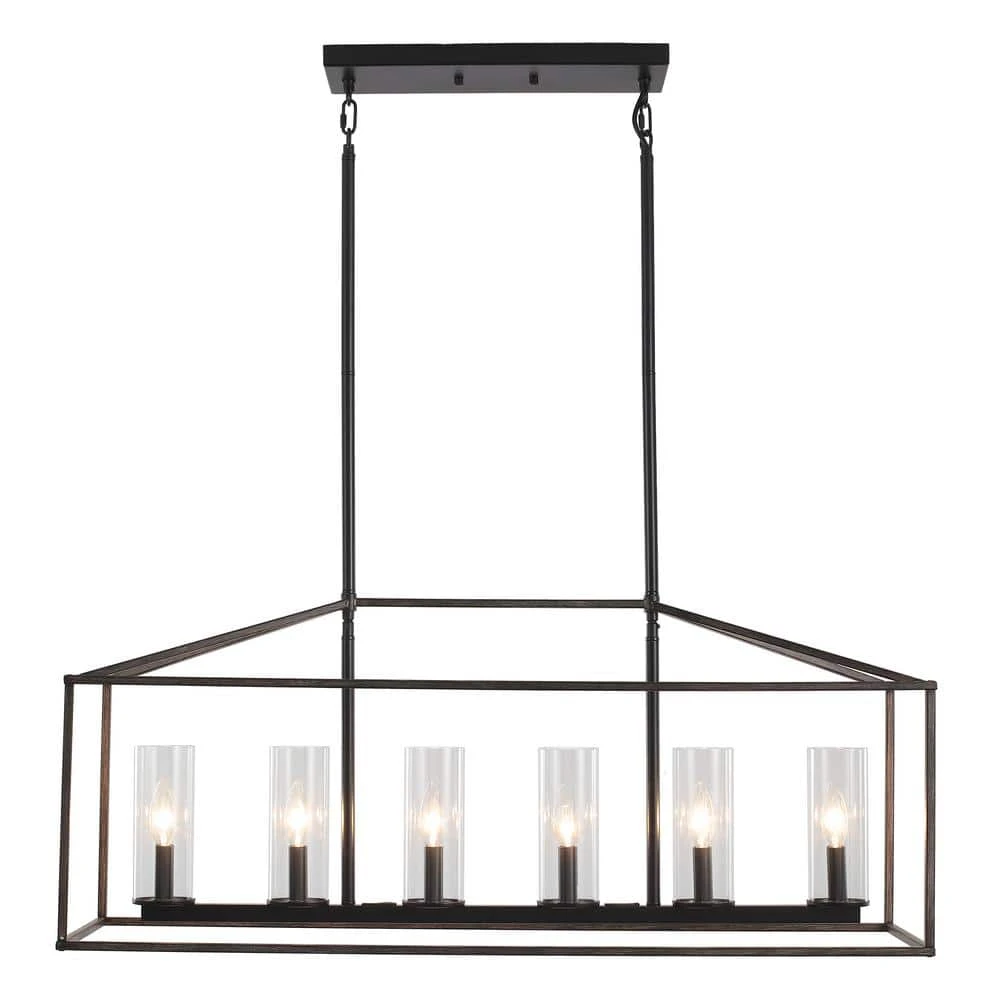 Illuminate your kitchen island or dining area in modern style with this 6-pendant kitchen linear light. The linear fixture showcases an open, geometric frame with matte black finish, and its design features six clear glass shades that let the candelabra-base lights (not included) shine from within. This light is perfect for adding an ambient glow to your cooking and dining, and its hanging length are adjustable to suit your space. Transform your dining area with this essential chandelier to add elegance and sophistication. This attractive piece captures the essence of a cozy lodge while still maintaining a timeless appeal. It is ideal for enhancing a rustic ambiance or adding a touch of warmth to a more conventional setting. With various vintage metallic shades to select from, you can easily discover the ideal color to complement your home decor.