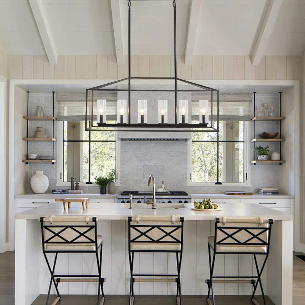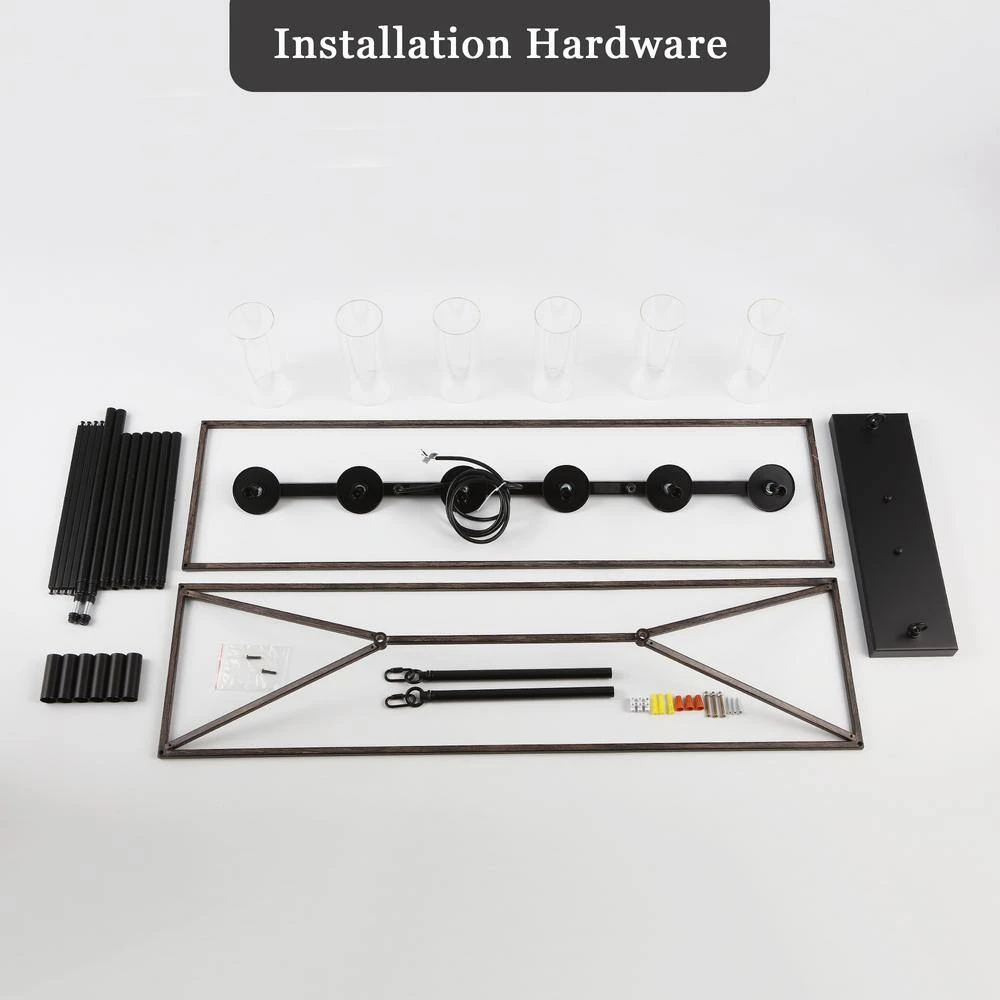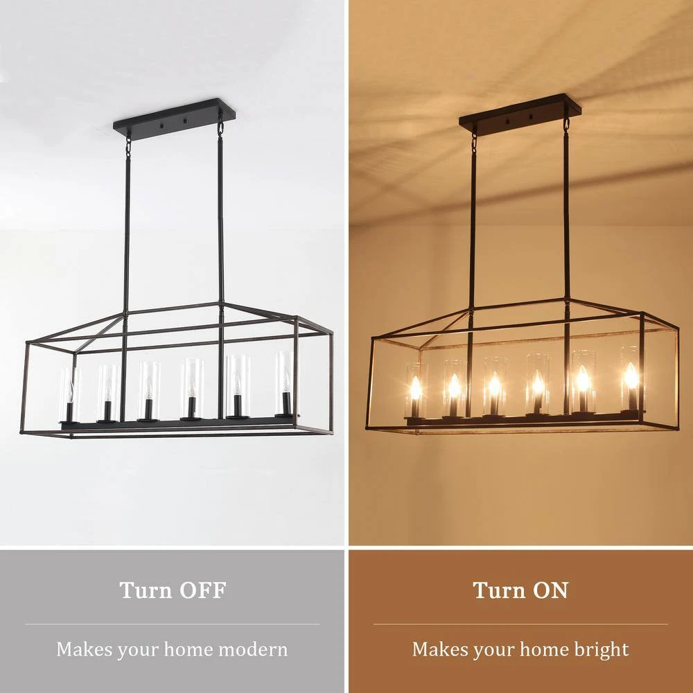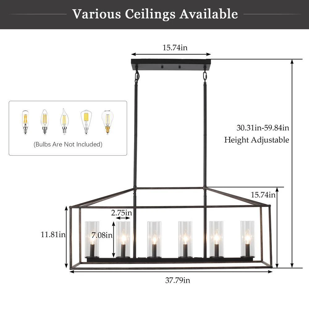 Illuminate your kitchen island or dining area in modern style with this 6-pendant kitchen linear light. The linear fixture showcases an open, geometric frame with matte black finish, and its design features six clear glass shades that let the candelabra-base lights (not included) shine from within. This light is perfect for adding an ambient glow to your cooking and dining, and its hanging length are adjustable to suit your space. Transform your dining area with this essential chandelier to add elegance and sophistication. This attractive piece captures the essence of a cozy lodge while still maintaining a timeless appeal. It is ideal for enhancing a rustic ambiance or adding a touch of warmth to a more conventional setting. With various vintage metallic shades to select from, you can easily discover the ideal color to complement your home decor.