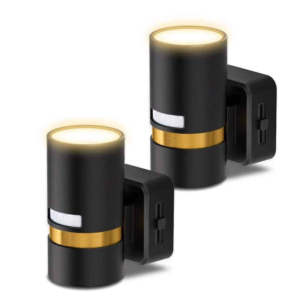 These plug-in night lights feature a modern cylinder shape with a gold accent ring, adding a sleek touch to your space. Designed with motion detection and customizable dimming, they adapt to your lighting needs at any time of day or night. The soft warm glow enhances comfort and visibility, making them perfect for any indoor area that needs subtle lighting.