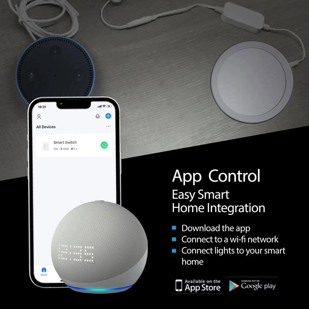 - EASY SMART HOME INTEGRATION: Just download the app, connect to your 2.4 ghz wi-fi network, connect the smart switch, add your device, and presto! You’ve got precise voice control of your cabinet lights; no hub required. Now you can quickly set them to a specific brightness level or schedule them to turn on/off, brighten, or dim at certain hours.