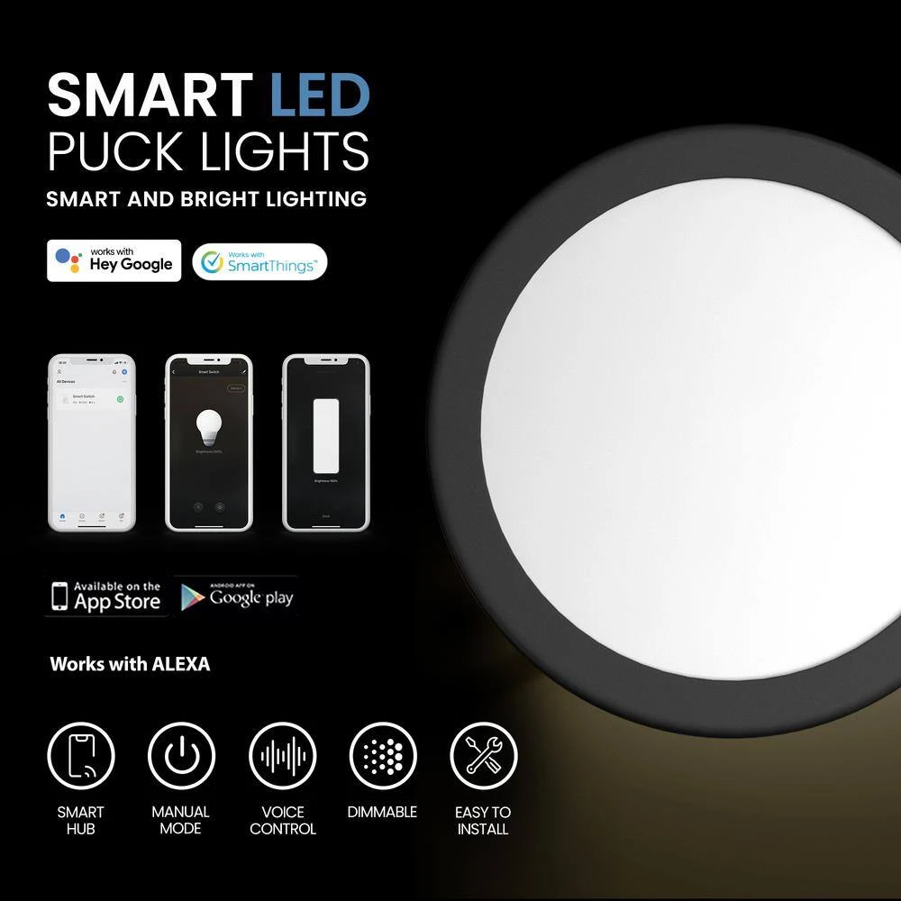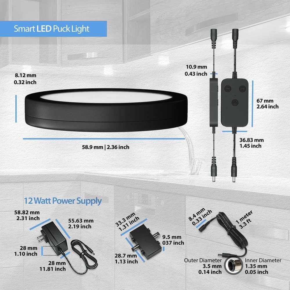 Enjoy Simplicity, Efficiency and Performance with this Alexa, Google and SmartThings Compatible Under-Cabinet Lighting from EShine.Six 2-watt lights on a 2.36-inch puck offering 900 lumens of brightness in an easy-to-install package, these under-cabinet lights can transform your living and working environment with warm light that helps you get it done.No Hub Necessary:Adding precision-controlled lights to your Alexa, Google or SmartThings smart home has never been so simple. Configure the app, connect to your wi-fi, (2.4 ghz required,) plug in your lights, and you’re in business.Simple Light:If all you want is a warm light that lets you control the brightness, you’ve got one right here. Just plug the power supply into the switch, hit the power summary, select your desired brightness, and you’re in business.Drop that Energy Bill:Running at 12 watts but putting out 900 lumens of brightness, these lights offer a supremely efficient alternative to your current lighting. Install these in the living and workspaces throughout your home, office or shop, and you’ll be amazed by the savings.PACKAGE CONTENT:6X LED puck lights6X 3M sticker for LED puck lights1X Smart switch1X 12W Power supply1X 3.3ft male-female extension cable24X Wire Clips with 3M stickers preinstalled12X ScrewsEach LED puck has 9 LED’s and 150 lm brightness. Puck Size 2.36 (D) x 0.32(H) inches
