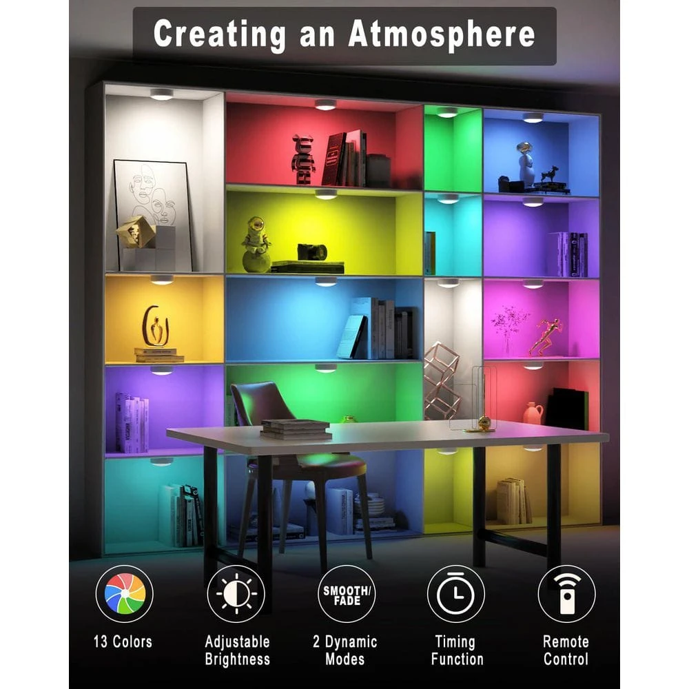 Upgrade your home lighting with these LED puck lights! With a 3 – inch diameter, they offer a larger and brighter light – emitting area. Their broad applicability makes them suitable for multiple scenarios such as kitchens, bedrooms, and closets, especially useful for under – cabinet areas with insufficient light. Installation is a breeze; simply stick them onto any surface using the included 3M double – adhesive tape. These lights are highly adjustable, featuring 16 color schemes and 10 luminosity levels. You can set your favorite color and brightness via the remote control or by long – pressing the light surface. There are also 2 dynamic luminous modes and timer presets for added convenience. The package comes with 6 lights, 6 adhesive pads, 2 remote controls, and 1 user manual. Not only do they provide practical lighting, but they also create a colorful atmosphere, enhancing the overall ambiance of your home.