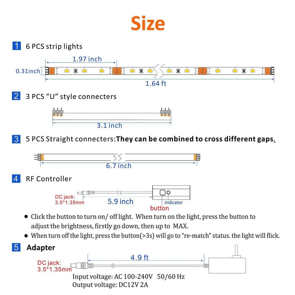 - DIY LED light strip set includes 6 pre – cut strips, totaling 9.8 ft. It offers various connection options, perfect for upgrading cabinets, closets, desks, TV backs, bookshelves, beds, wardrobes, display cases, bedrooms, and workbenches.