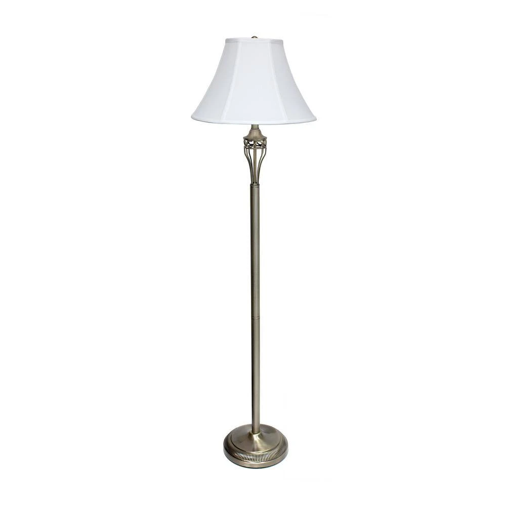 Upgrade your decor with this beautiful 3 piece matching table and floor lamp set! The antique brass bases detail fine lines and sophisticated detail beneath a crisp white fabric shade, blending effortlessly into a number of decor styles. This is the perfect set to sit in your room of choice, whether it be your living room, bedroom, or office.