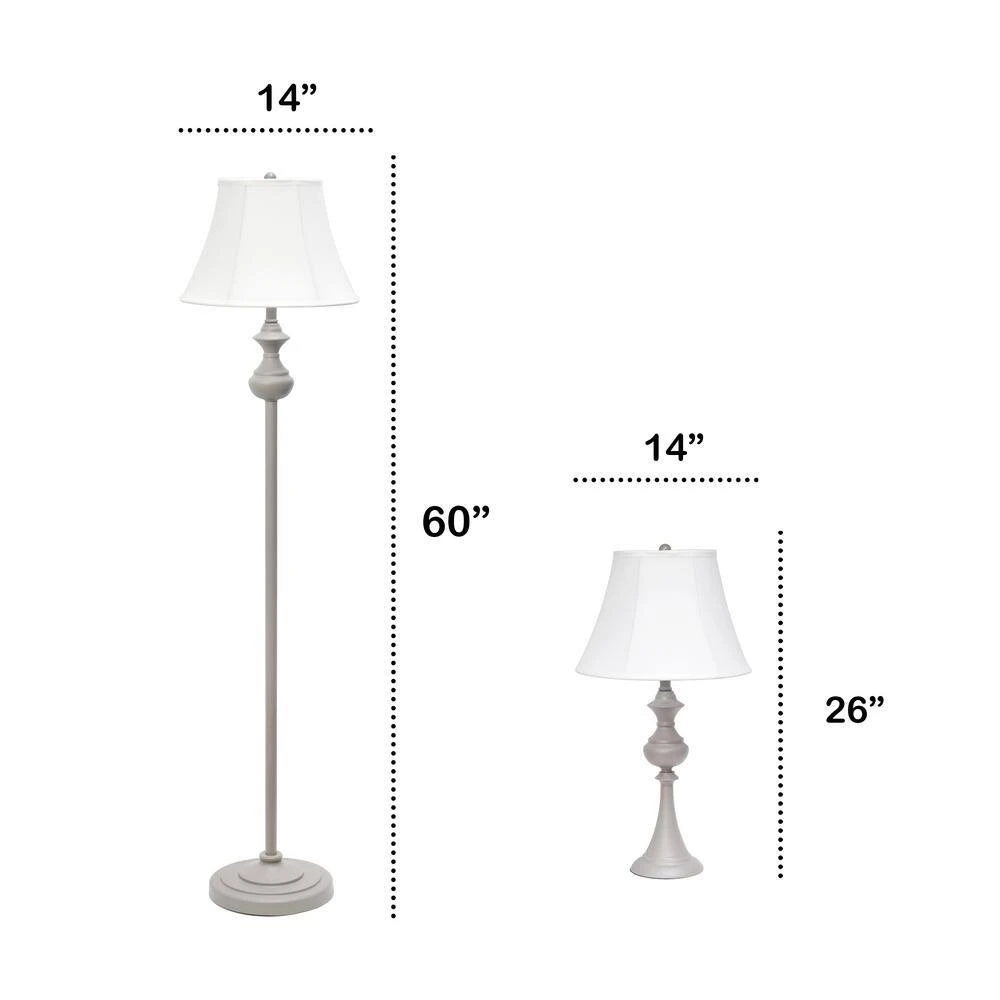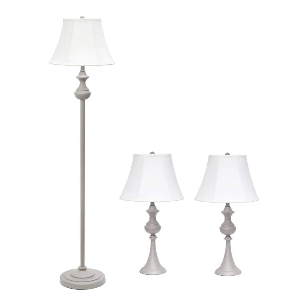 Upgrade your home with this beautiful 3 piece matching table and floor lamp set! The gray metal finish throughout the subtly detailed base of each lamp is paired with a lovely white fabric shade to bring you a sophisticated ambiance while satisfying your lighting needs. Perfect for modern, traditional, and contemporary spaces!