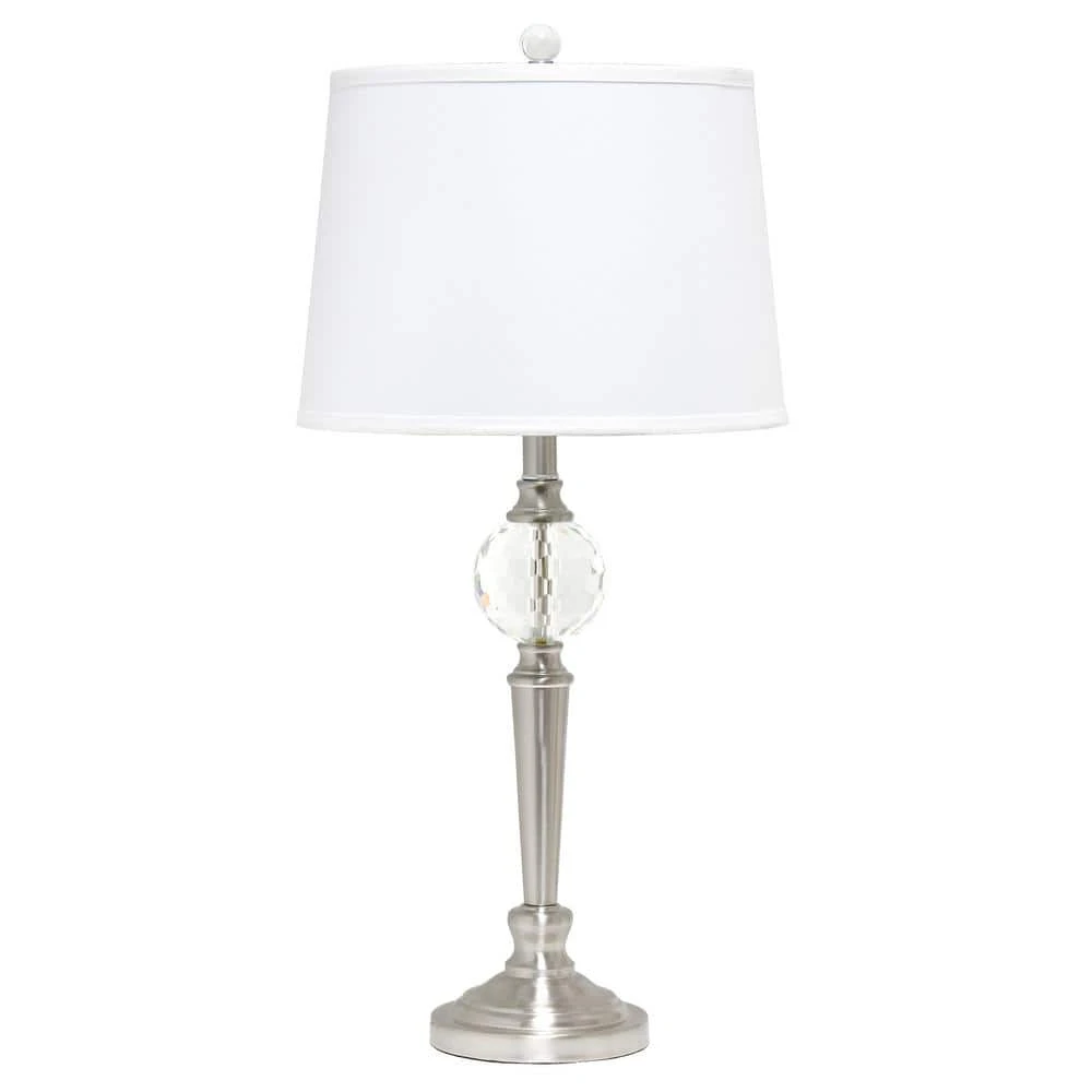 - Beautiful white fabric shades and an exquisite brushed nickel base with a crystal accent