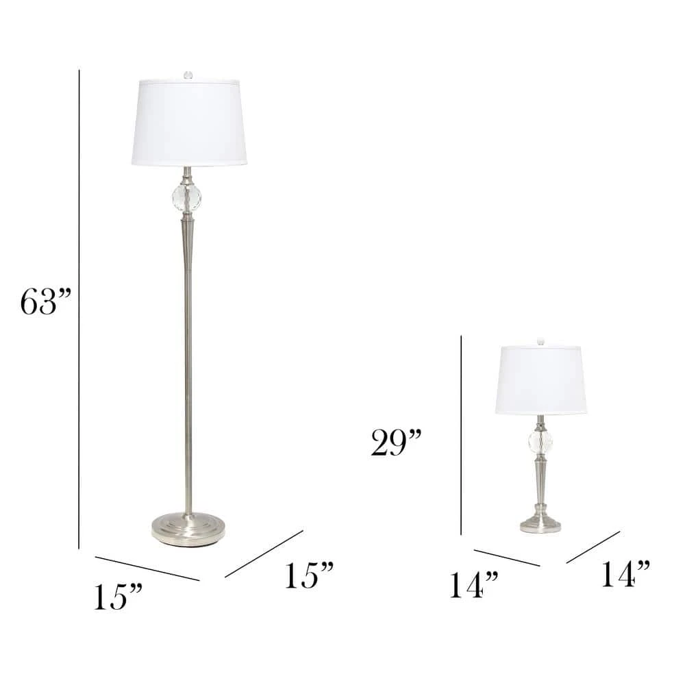 This beautiful 3 pack lamp combo consists of 1 floor lamp with 2 matching table lamps. A crystal accent sits on the brushed nickel base of each lamp, paired with a white tapered fabric shade for a clean, modern look to add to your decor. This 3-pack lamp set is the perfect addition in adding just the right touch of glam mixed with modern to your space of choice.