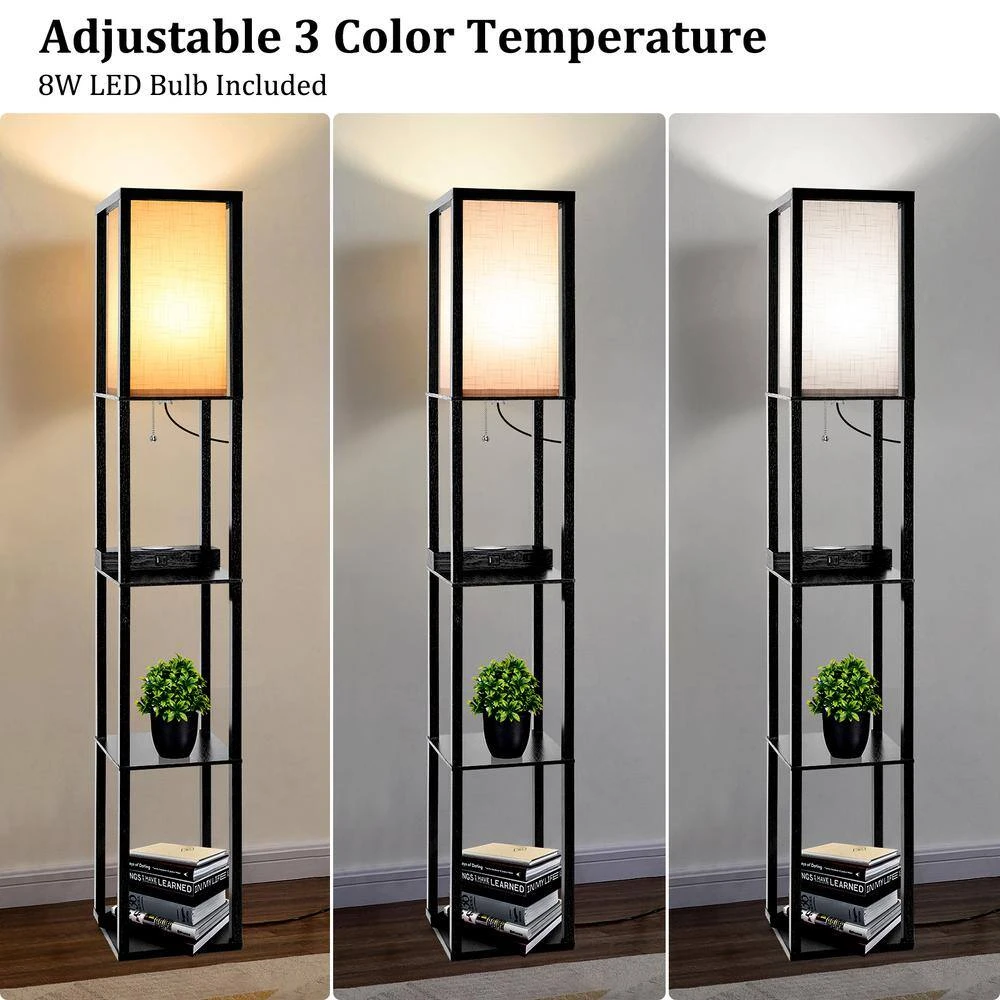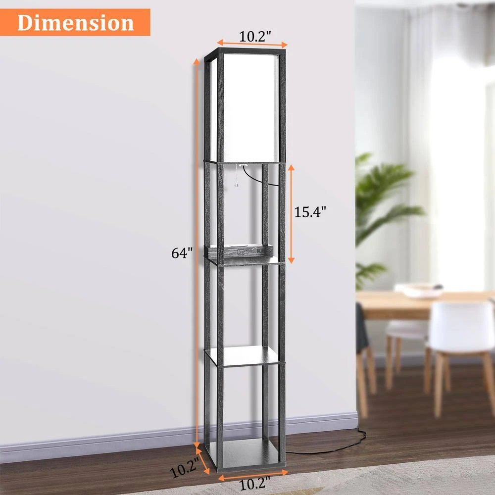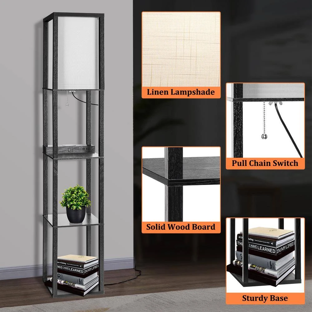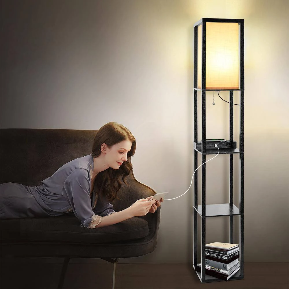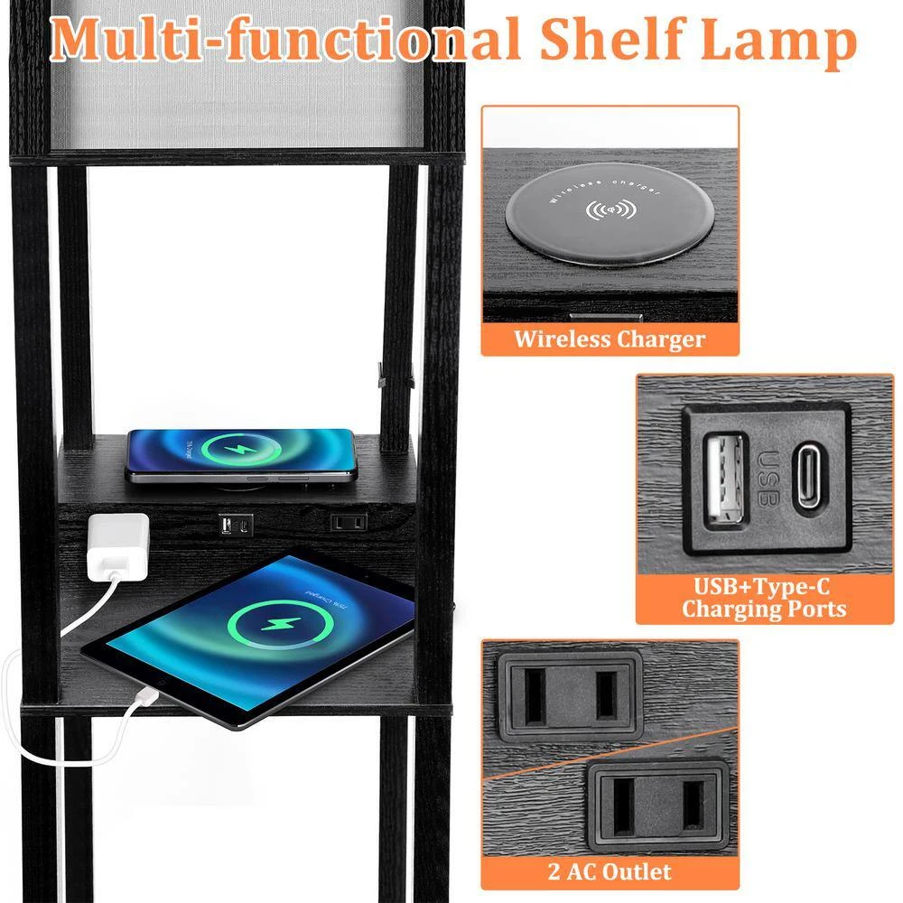 This floor lamp is combined with the storage shelf, charge station and led floor lamp. Multi-functional lamp meets your lighting and storage needs. The 3-tiered shelves floor lamp allows you to store books, photos, potted plants, collection and other items. You can place maximum of 50 lbs. weight items on each shelf . It has more storage space to organize items scattered in your living room, office, bedroom. Make your home more tidy and say goodbye to messy rooms. Features a linen shade and a natural wood appearance, the floor lamp fits most decor style such as Asian, mid-century, farmhouse and modern styles. Compared with other shelf floor lamps, our lamp is equipped with wireless charging station, which is compatible with iPhone and Android devices. Also it comes with 1x USB charging port,1x Type C port, 2x power outlets. You could charge several devices like smartphone, kindle, iPad, Bluetooth speaker. After that you don’t have to worry about the shortage of sockets and the lack of space for charging devices.