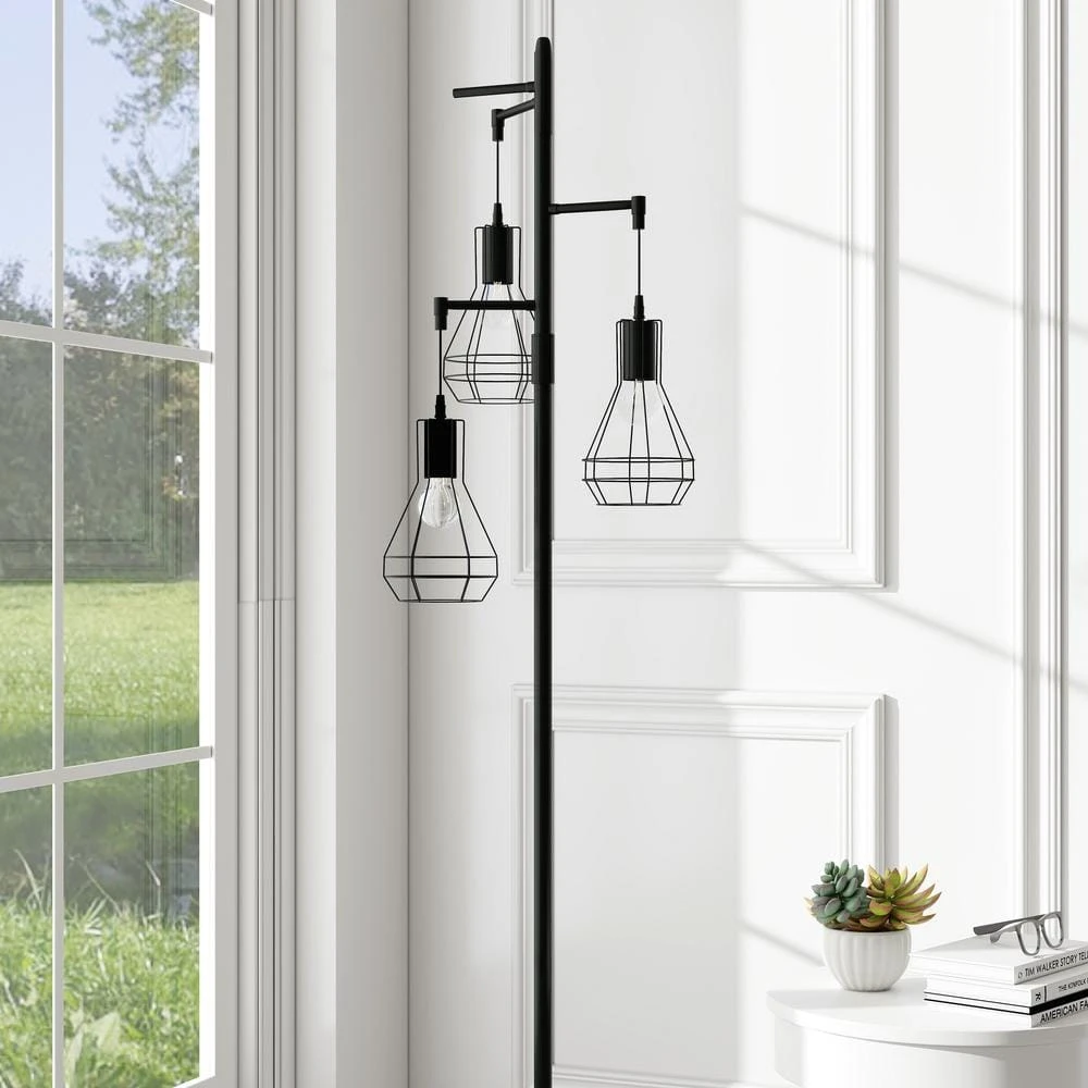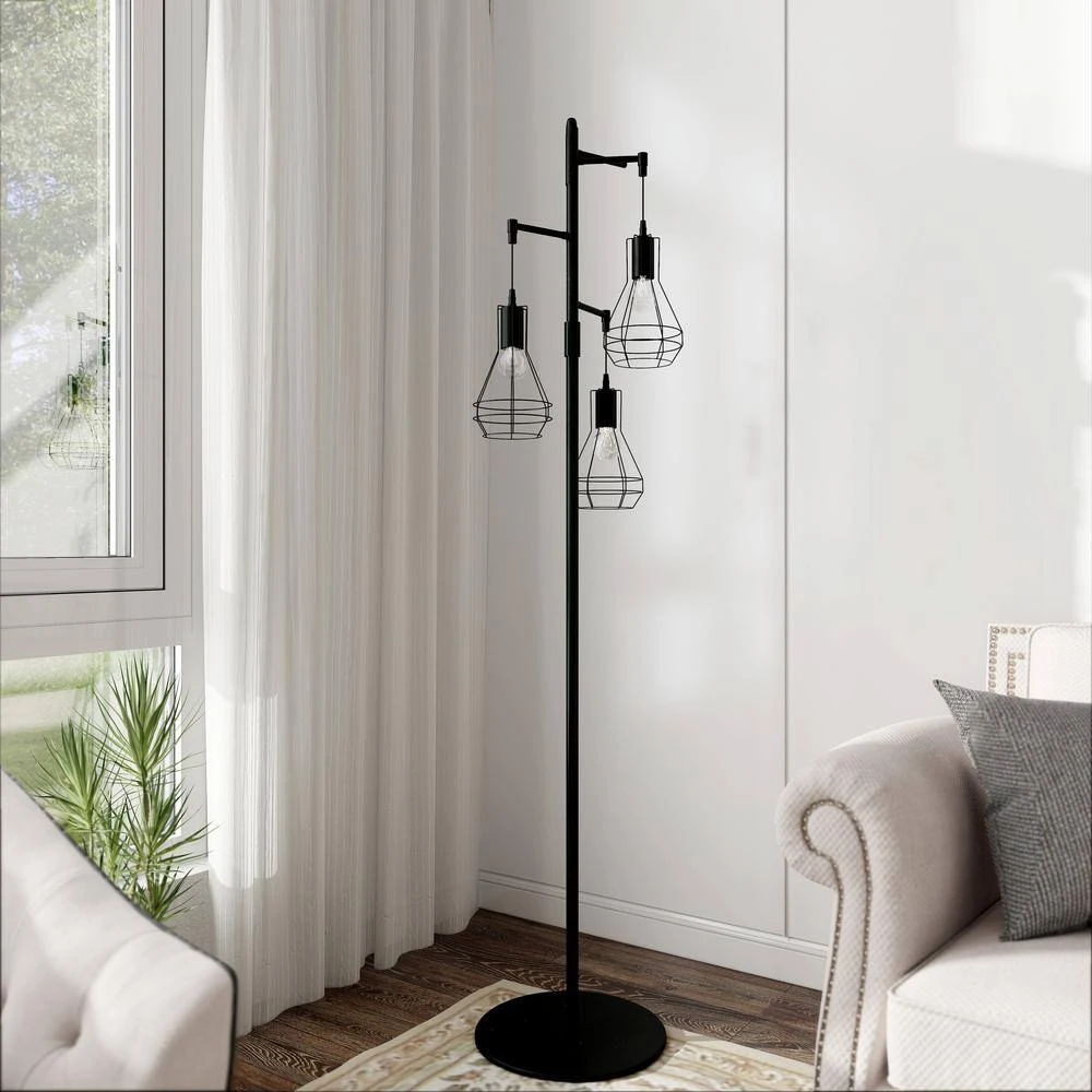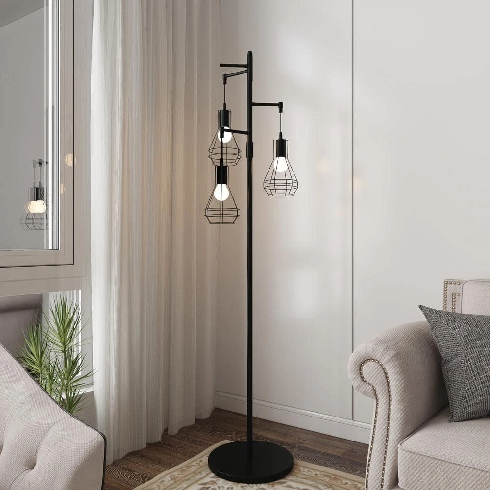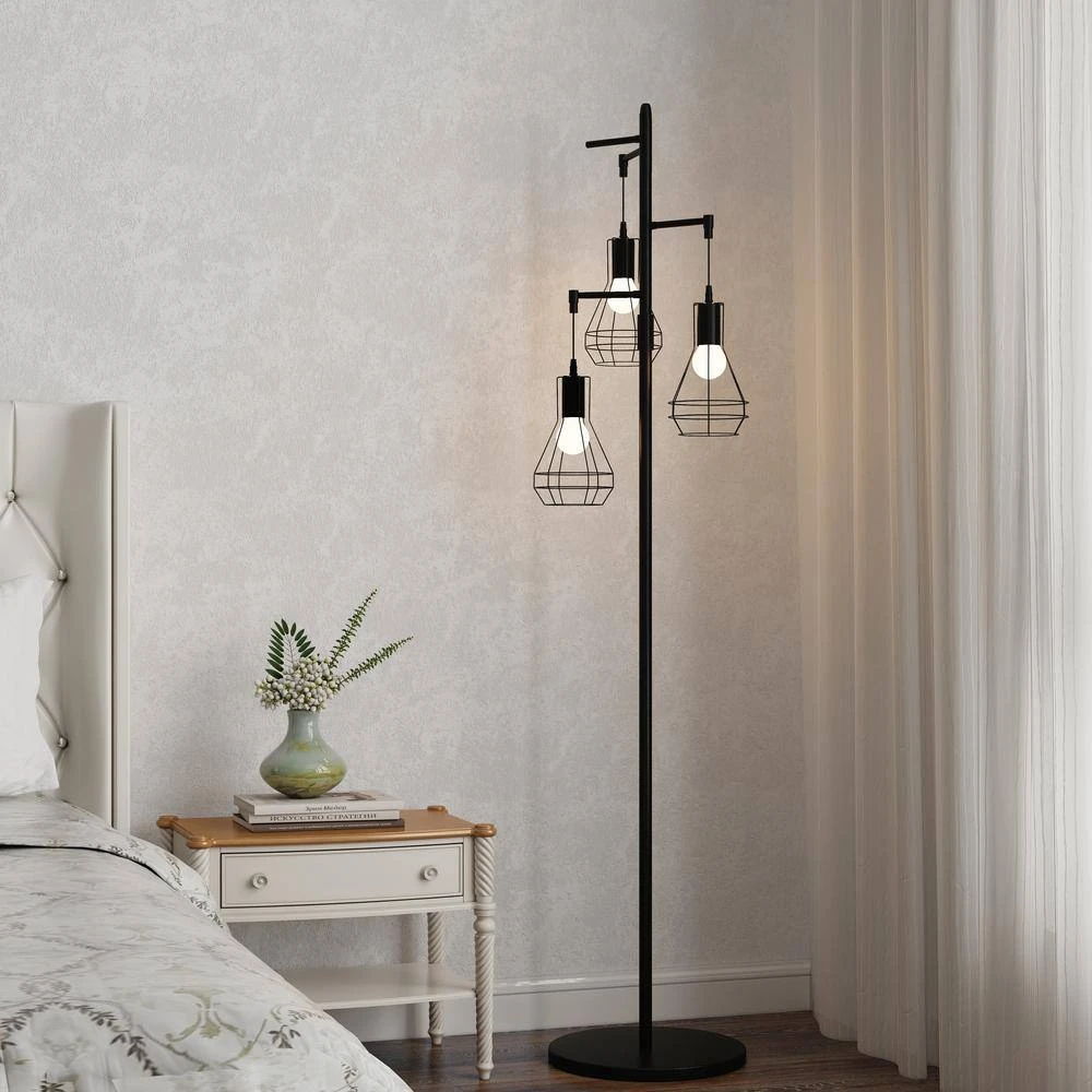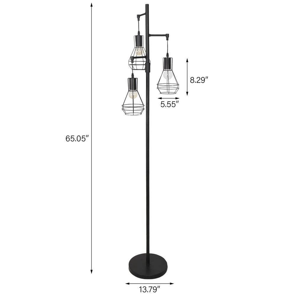 This tree lamp infuses your living space with an industrial,edgy style.It has a stable black metal base and a slender body measuring 65.05 in.H.Three lights adorn the top with a playful,and lampshade material is woven/metal 2 types.Tree-like appearance,and the cage lantern shades create a modern,adorable look Each grooved lampshade is compatible with one E26/Medium(Standard) bulb (not included),which is energy and cost-efficient.This floor lamp is not dimmable,if you prefer a softer light,simply swap for lower-wattage bulbs. Best of all,The on/off switch is on the cord at the base of this lamp,so no need to hunch over-just tap with your foot.