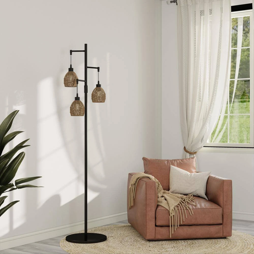 This tree lamp infuses your living space with an industrial,edgy style.It has a stable black metal base and a slender body measuring 65.05in.H.Three lights adorn the top with a playful,and lampshade material is woven/metal two types.Tree-like appearance,and the cage lantern shades create a modern,adorable look Each grooved lampshade is compatible with one E26/Medium(Standard) bulb (not included),which is energy and cost-efficient.This floor lamp is not dimmable,if you prefer a softer light,simply swap for lower-wattage bulbs. Best of all,The on/off switch is on the cord at the base of this lamp,so no need to hunch over-just tap with your foot.