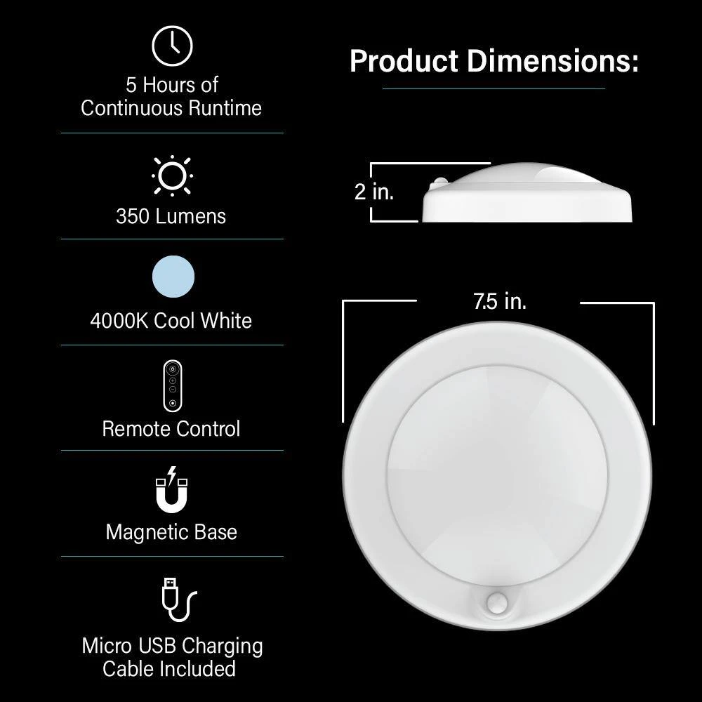 The Feit Electric 7.5 in. round rechargeable battery remote controlled ceiling LED fixture adds 350 Lumens and 4000K Cool Light to any commercial or residential space. Using only 5-Watts of energy, this ceiling light provides up to 25,000 life hours or 22.8-years of reliable illumination. Its magnetic base allows for hassle-free installation anywhere and eliminates the need for extra mounting tools. Make any workspace functional by adding task lighting overhead to help you accomplish your tasks. Each ceiling light is equipped with a powerful battery that provides 5-hours of crisp lighting at maximum brightness on a single charge. When the battery runs out easily recharge the 35Wh battery with the included 3 ft. USB cable and continue using without the need to purchase replacement batteries or use power cords that get in the way. Avoid the inconvenience of reaching up to the light to turn it on or off by using the included remote control. Adding beauty and functionality is easy with Feit Electric multi-function round ceiling LED lights.