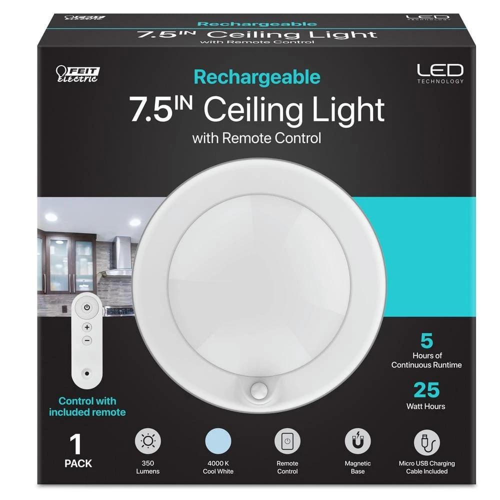 The Feit Electric 7.5 in. round rechargeable battery remote controlled ceiling LED fixture adds 350 lumens and 4000K Cool Light to any commercial or residential space. Using only 5 Watts of energy, this ceiling light provides up to 25,000 life hours or 22.8 years of reliable illumination. Its magnetic base allows for hassle-free installation anywhere and eliminates the need for extra mounting tools. Make any workspace functional by adding task lighting overhead to help you accomplish your tasks. Each ceiling light is equipped with a powerful battery that provides 5 hours of crisp lighting at maximum brightness on a single charge. When the battery runs out easily recharge the 35Wh battery with the included three-foot USB cable and continue using without the need to purchase replacement batteries or use power cords that get in the way. Avoid the inconvenience of reaching up to the light to turn it on or off by using the included remote control. Adding beauty and functionality is easy with Feit Electric multi-function round ceiling LED lights.