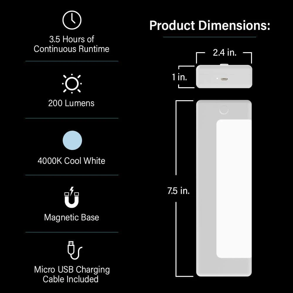 Add 4000K Cool White and 200 lumens of light with Feit Electric’s multi-function, 7.5 in rechargeable LED under cabinet light. They feature an innovative space-saving design that allows them to easily fit under cabinets, in workspaces and kitchens, or other dark locations to provide extra illumination when needed. With the latest in LED technology, these lights use less power and energy compared to traditional undercabinet lights. Each undercabinet light is equipped with a rechargeable battery which means you won’t need to spend on replacement batteries or plug in the light to power up. When their 3.5-hour battery runs out, easily recharge it with the included USB charging cable, and continue using. With easy self-adhesive installation, just peel off the tape and push to stick on most flat surfaces, there is no need for extra tools. The light connects to the mounting plate using built-in magnets and can be quickly detached to recharge. Give your kitchen a modern look easy with Feit Electric multi-function LED under cabinet lights.