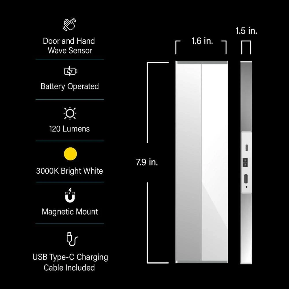Feit Electric’s 3000K Bright White, 120 Lumens, rechargeable LED cabinet door light adds convenience to a variety of applications in your home and more. This 8 in. LED cabinet door light features a gray, rectangular low-profile design that easily slips into small spaces such as cabinet doors and other locations to provide extra illumination when needed. There is no need to fumble with hard to find ON/OFF summarys or switches compared to those found in other cabinet door lights. with the latest in LED technology, these lights use less power and energy compared to equivalent incandescent lights. Each cabinet door light features an integrated motion sensor that makes it fast and easy to provide the perfect of amount of lighting when you need it by simply opening the door or waving your hand it front of it. Its powerful battery provides up to 3.5 hours of light at maximum brightness. Each LED light is equipped with a rechargeable battery which eliminates the need to plug in the light to power up. When its battery runs out, easily recharge it to full overnight with the included USB cord and continue using. with easy self-adhesive installation, just peel off the tape and push to stick on most flat surfaces, there is no need for extra tools. Adding beauty and functionality is easy with Feit Electric multi-function cabinet door LED lights.