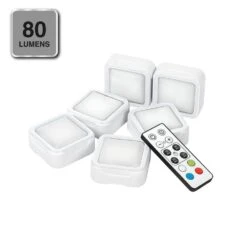 80-Lumens LED Puck lights are the perfect solution to easily light and change the mode of any room. Switch lights on and off or change colors to red, green, blue and white. You can adjust brightness or set a timer with the remote control. Timer Settings, 10-minutes, 30-minutes, 60-minutes or 120-minutes. The lights are battery operated so there is no need for wiring, simply load the batteries. Mounting tape attached the back of each light allowing you to mount anywhere. Batteries included.