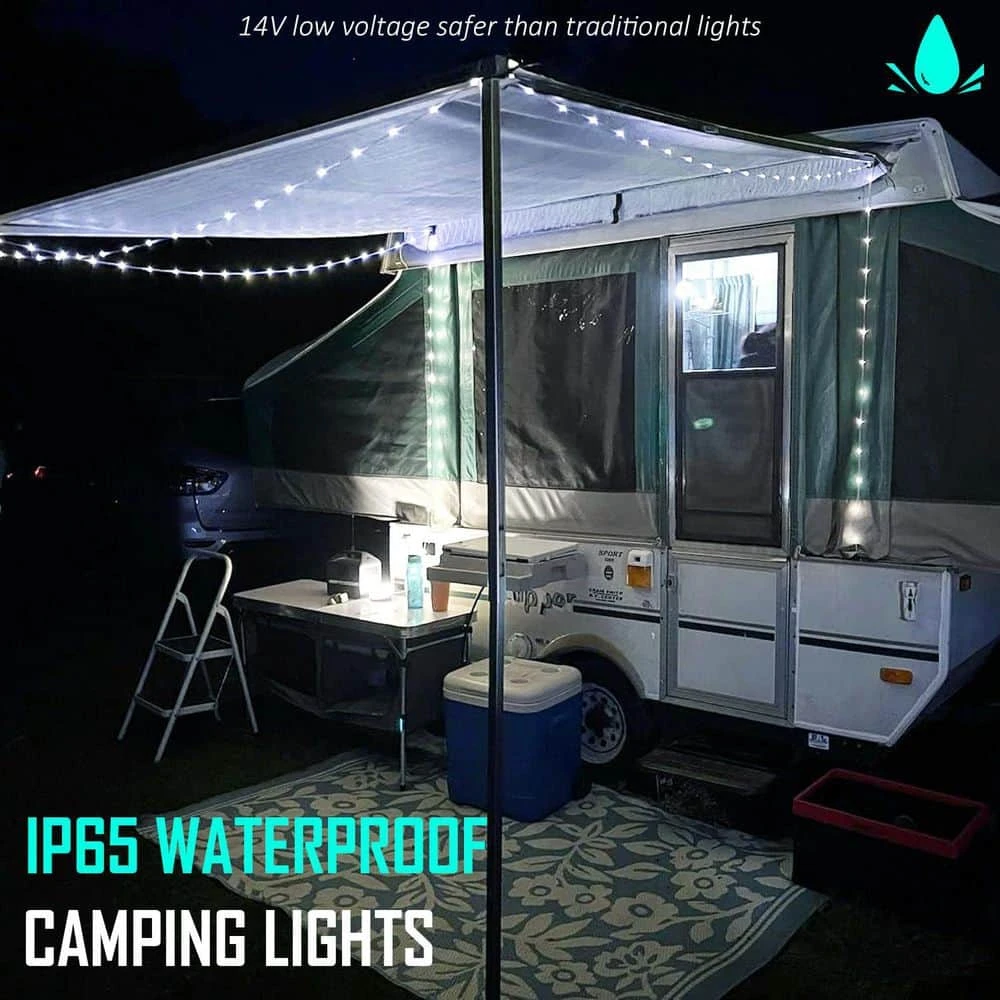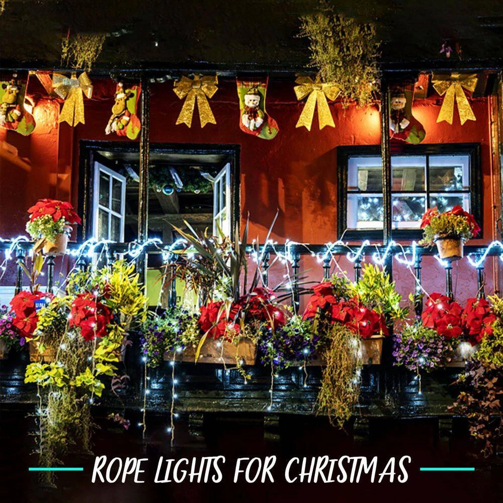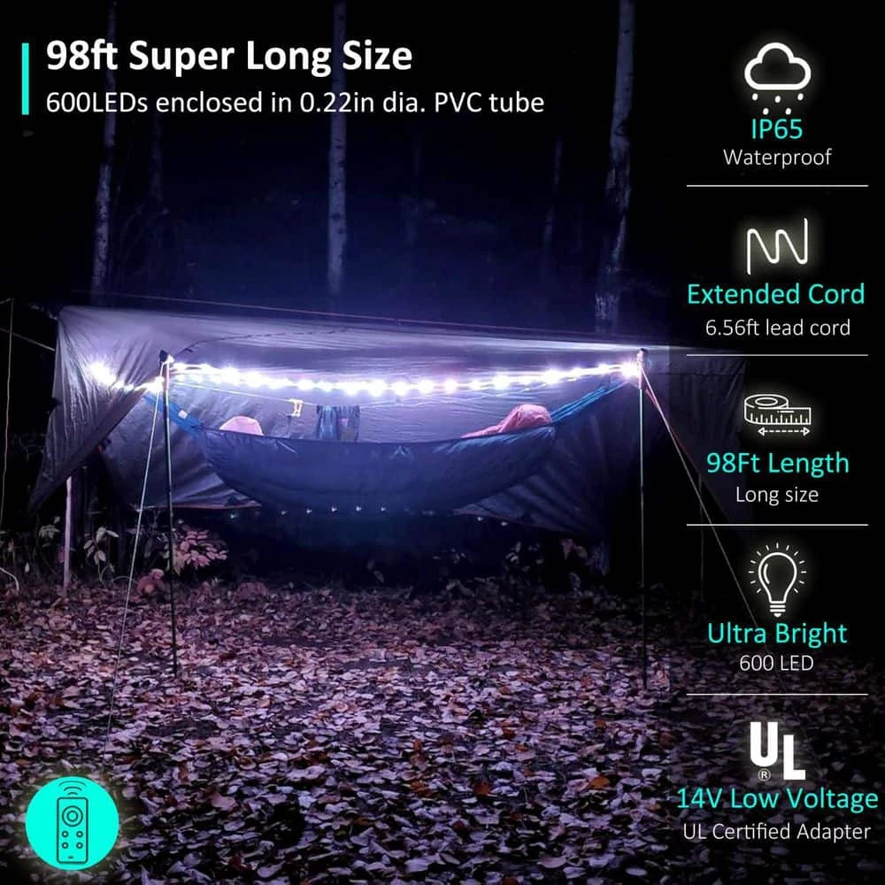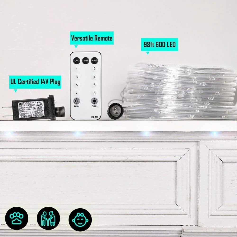 98ft rope lights with 600 bright LEDs! The IP65-rated PVC tubing is durable for outdoor use with 8 lighting modes and dimmable options. Low 14V voltage ensures safe operation for extended periods. Includes remote for convenient control.