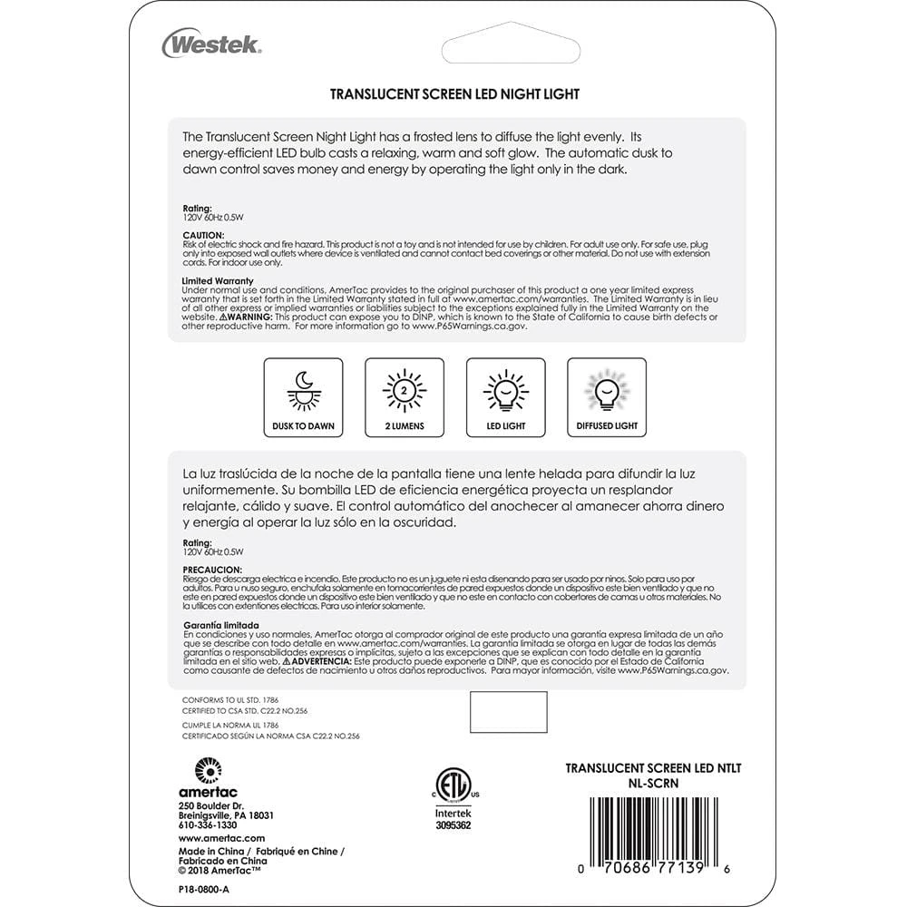 The Westek NL-SCRN Automatic Translucent Screen Light is the perfect night time lighting solution. This device automatically turns on in low light; projecting 2 lumens of illumination forward; enough to see by without being obtrusive. Great for hallways, entryways, basements, bathrooms and more. Designed with a transitional style and white finish that works with any decor. AmerTac manufacturing brands offer complete lines of distinctive decorative home accent products that include trend-setting wall plates, money saving LED night lights, innovative under cabinet lighting and LED battery operated lights. We also offer utility product lines including energy-saving timers, dimmers and lighting controls, as well as an extensive offering of consumer electronics accessories for the home and office.