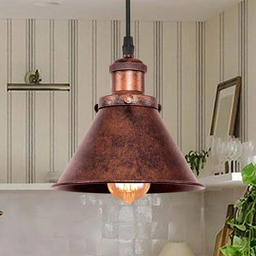 Outstanding in its antique copper finish, HUOKU’s 1-light pendant lighting hanging barn light features a distressed, intentionally aged look that adds character to any space. The metal cone shade, with a diameter of approximately 7 inches, includes rolled edges that enhance its industrial and farmhouse appeal. This ETL-listed light is equipped with a 6-foot adjustable cord, making it perfect for various heights and spaces. It uses an E26 socket and is compatible with A19 bulbs, though the bulb is not included. The dimmable feature allows for adjustable brightness, making it ideal for hanging over dining tables, in dining rooms, above kitchen islands, and in other areas where a rustic, town-industrial style is desired. The combination of its rustic charm and practical features makes this pendant light a versatile addition to any home.