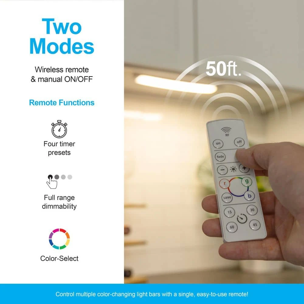 Control the colors of the rainbow with the GE 12 in. Color-Changing Wireless Light Bar with Remote. The battery-powered light provides the full spectrum of color or bright, white light without wiring or plugging in the fixture. Activated by a manual ON/OFF switch or the included remote control, the light is perfect for kitchens, home bars, dens, children’s rooms, holidays, special occasions and any other time you need a versatile light source. The RF remote is powered by one provided CR2032 battery and allows you to turn the light bar on and off, select custom colors or white option, adjust brightness, save your favorite color setting and choose a fade feature to continuously cycle through a range of colors. A timer function turns the light off after 15, 30, 45 or 60-minutes to conserve battery life. Installing the light is simple using the included hardware or double-sided mounting tape. Powered by 6AA batteries, long-lasting LEDs illuminate any dry, indoor location with ease. See your space in color with the GE 12 in. Color-Changing Wireless Light Bar with Remote.