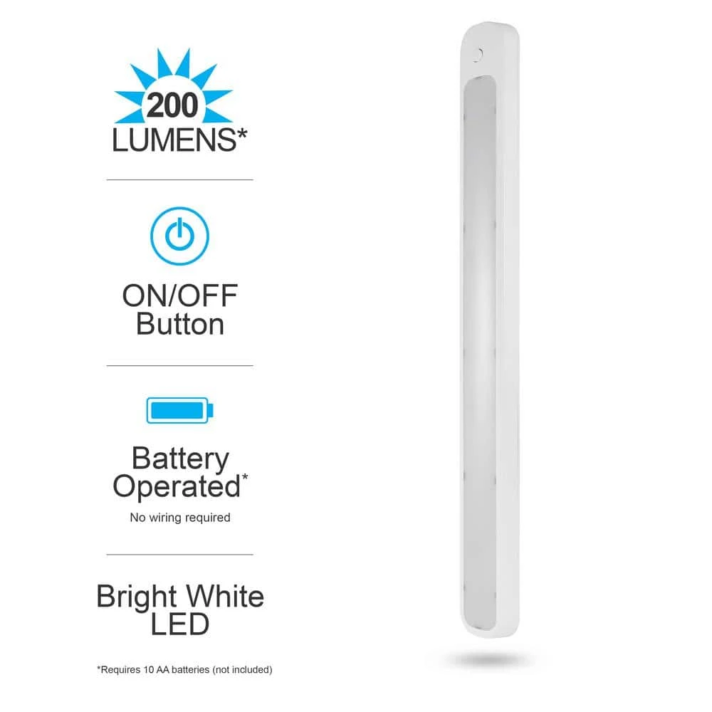 A little light goes a long way with the GE Battery-Operated Light Bar. This outstanding light bar conveniently combines high-quality lighting, wire-free installation and easy operation. The battery powered light bar provides your space with bright white light when you need it the most. Its sleek, minimalistic design makes it great for renters and homeowners alike – ideal for kitchens, pantries, closets, garages, RVs, sheds and much more! This 24in. light bar is battery powered and can be installed in nearly any indoor location. No external wiring means you can quickly install this light within minutes – all the mounting hardware you need is included. Simply remove the back cover, install 10 AA batteries (not included), mount the back cover with the provided screws or mounting tape and reattach the light! To turn the light on, just press the power summary. High-quality, energy efficient and versatile – bring light where it is needed with the GE Battery-Operated Light Bar!
