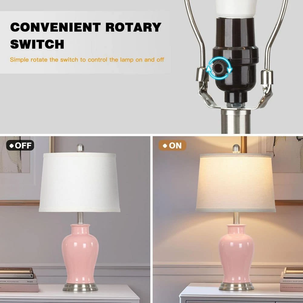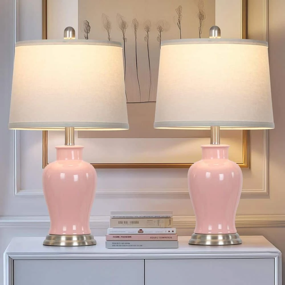 This elegant 23-inch table lamp brings timeless style and warm ambiance to any room. The classic ginger jar-style ceramic base is finished in a glossy pink glaze, complemented by a gently tapered white fabric lampshade. Brushed NAB silvery-tone metal details, including a stepped finial and round base, add a refined touch. With a convenient two-way rotary switch and included LED bulb, this lamp is perfect for your nightstand, side table, or entryway console.