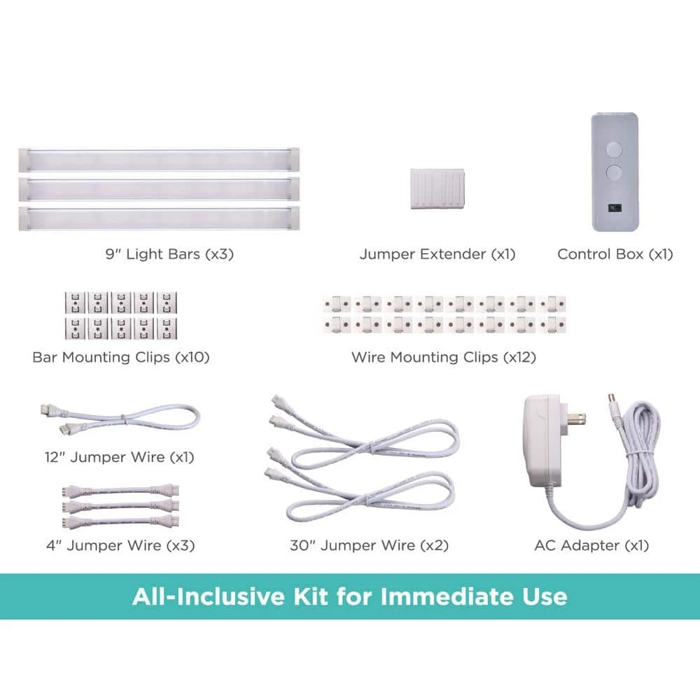 - All-inclusive kit for your convenience: contains (3) 9 in. ultra-thin light bars, (2) 30 in. jumper wires, (1) 12 in. jumper wire, (3) 4 in. jumper wires, (1) 24-watt plug-in power adapter, (1) hands-free/push-summary control box, (12) wire clips and (10) stick or screw-on light bar mounting clips