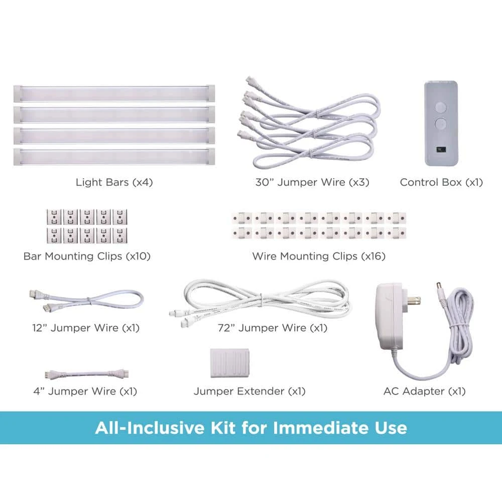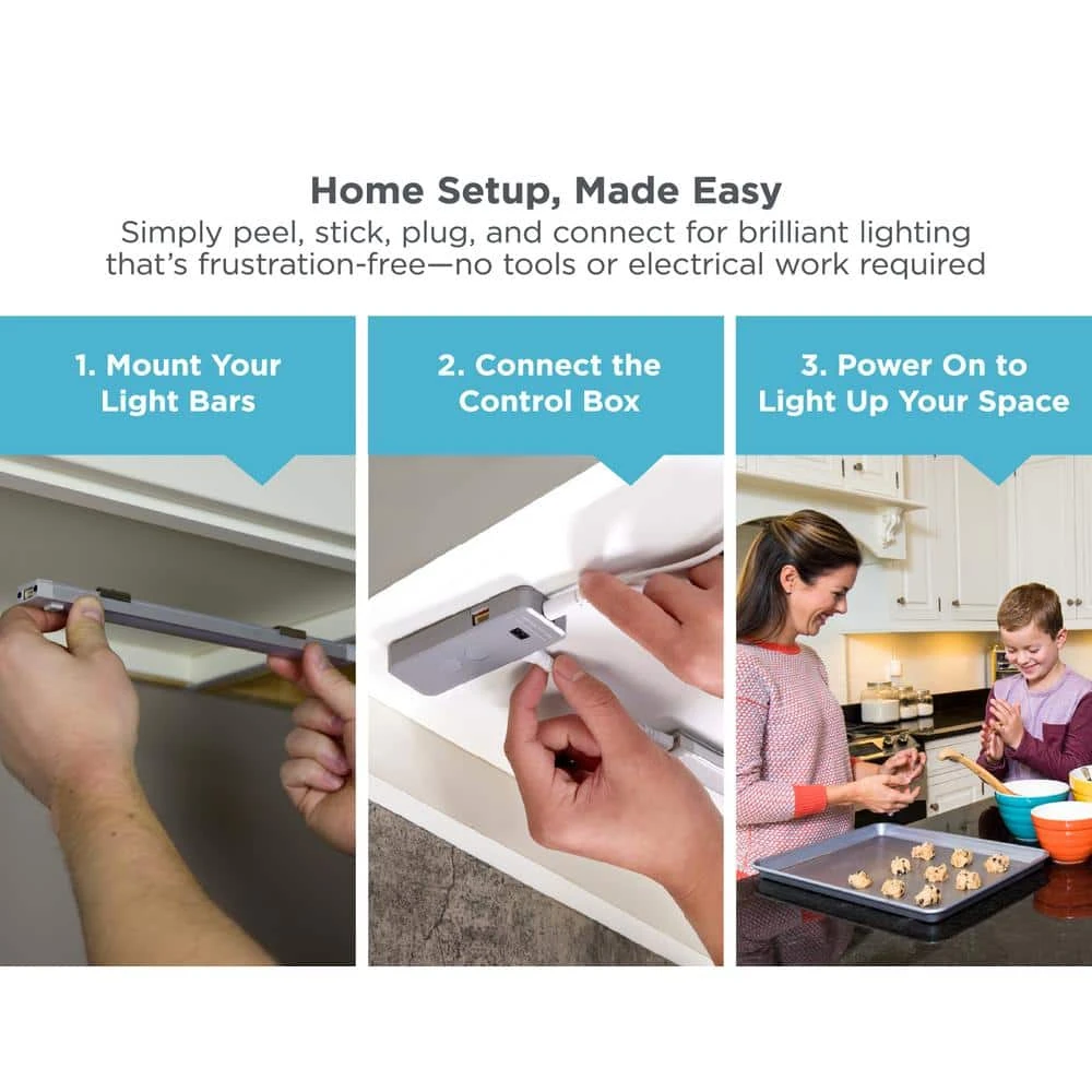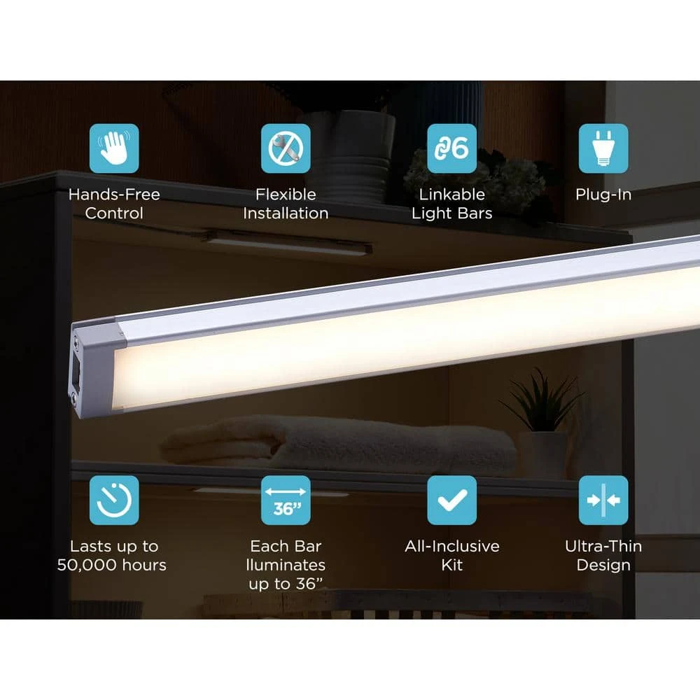 With its slim shape, the LED lighting emits a warm, rich accent lighting with an expanded light zone, while the unit remains hidden for a clean, contemporary style. Great for areas large or small, easily link up to 4 light bars (4 included) with each bar illuminating spaces up to 36 in. W. Conveniently included in the kit are various-sized jumper wires, which provide additional flexibility to cover longer distances or specialty configurations, such as jumping a stove. Depending on the task at hand, customize the light brightness by switching through the light’s 10 dimmer settings to find the perfect level of illumination while the flicker-free light softly fades out without any hot spots. In addition to the power switch on 2 of the lights, for convenience and speed, you can also wave your hand below the motion sensor to turn the light on or off. With cost-efficient LEDs, use 85% less energy for brilliant illumination lasting 50,000-hours. Conserve energy with crisp, warm white light that is high-contrast for vivid, brilliant colors, so you can work, play and create with unparalleled clarity.