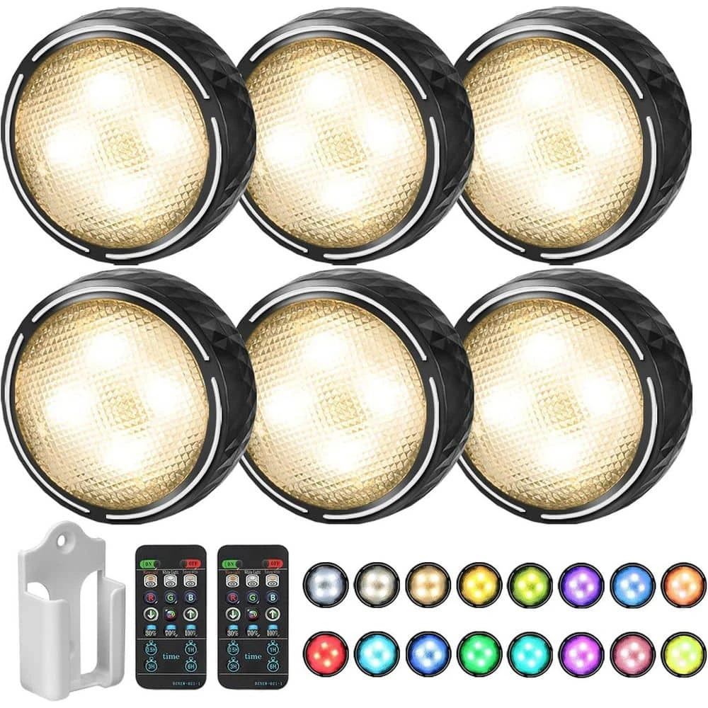 Enhance your home with these wireless LED puck lights! No wiring is needed, making them safe and simple to use. With a remote control, you can operate multiple lights at once, customize colors, and select from various light modes. Each light can also be controlled by tapping on the front cover. There are three brightness levels (30%, 70%, 100%) adjustable via the remote. The timer – off function helps you avoid leaving the lights on. These lights offer 14 colorful options and 4 dynamic modes, perfect for decorating wine cabinets, display cases, and kids’ dollhouses. They are easy to install on smooth surfaces using removable, traceless adhesive pads or screws. The set also includes a wall – mounted holder for two small remotes. The lights measure 2.95 x 2.95 x 1.18 inches, and the package size is 10.9 x 3.9 x 3.1 inches, weighing 0.9 pounds. A 6 – pack in black is available.