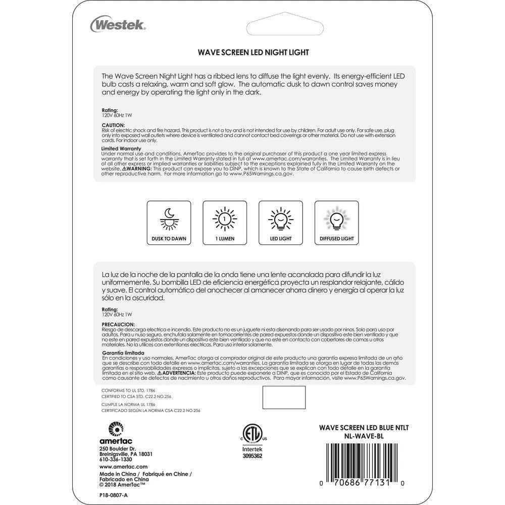 The Westek NL-WAVE-BL Wave Translucent Screen Automatic Light is the perfect night time lighting solution. This device automatically turns on in low light, projecting 1 lumen of warm illumination; enough to see by without being obtrusive. Great for bedrooms, hallways, entryways, basements, bathrooms and more. The blue rippled pattern cover design works with any decor. AmerTac manufacturing brands offer complete lines of distinctive decorative home accent products that include trend-setting wall plates, money saving LED night lights, innovative under cabinet lighting and LED battery operated lights. We also offer utility product lines including energy-saving timers, dimmers and lighting controls, as well as an extensive offering of consumer electronics accessories for the home and office.