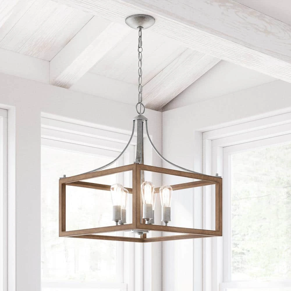 Enhance your home with this Hampton Bay Boswell Quarter five-light pendant. A galvanized finish and painted chestnut wood accents add an elegant style to your space. For convenience, this damp-rated, dimmable fixture comes with installation hardware to mount it up or down.