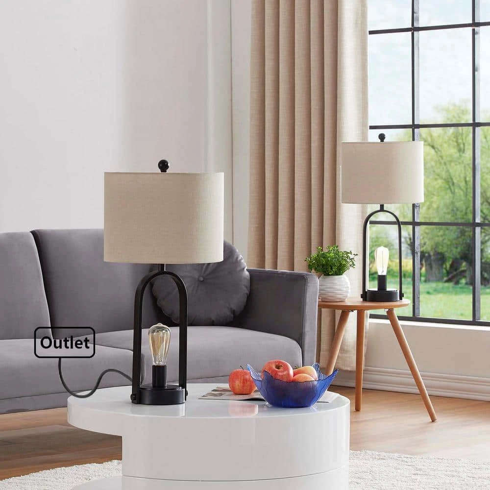 This 2-piece table lamp set brings versatile lighting to your bedroom or living room. Each lamp offers 2-light sources: 1 exposed at its base as a built-in nightlight and 1 under its lampshade for a bright ambient glow. These accent lamps feature arched, open-frame metal bases with black finishes. Each one is topped with an oatmeal-hued, drum-shaped linen shade. Spherical finials add a finishing touch, complementing traditional and contemporary decor alike. These lamps stand at 26 in. H, with each one accommodating bulbs up to 150-Watt (sold separately).
