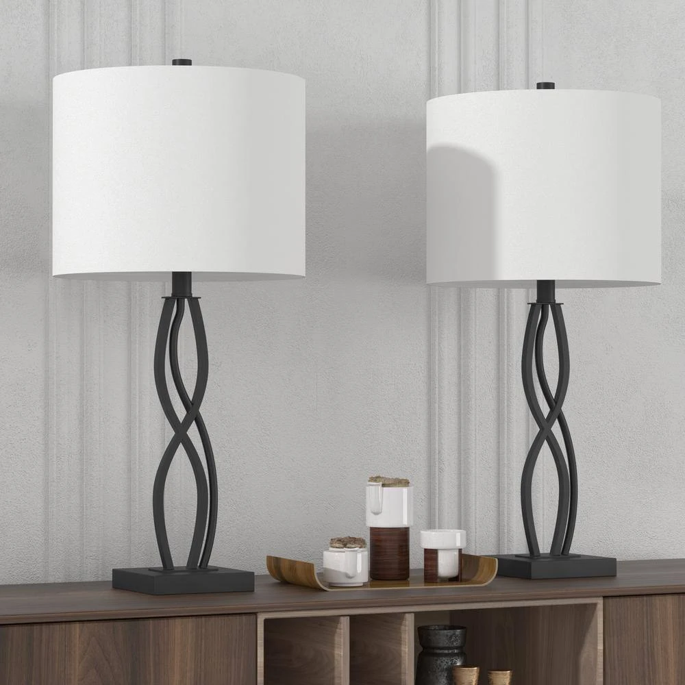 This 26 in. modern black desk lamp. With a smooth, interwoven metal base and a clear white lampshade, this lamp seamlessly blends classic and elegant modern design. Adding a touch of exquisite perfection to a living room, bedroom or office, it has a dimming function that provides warm ambient lighting while serving as a stylish statement piece. Durable, eye-catching and versatile, this is the ultimate choice for any modern indoor light.