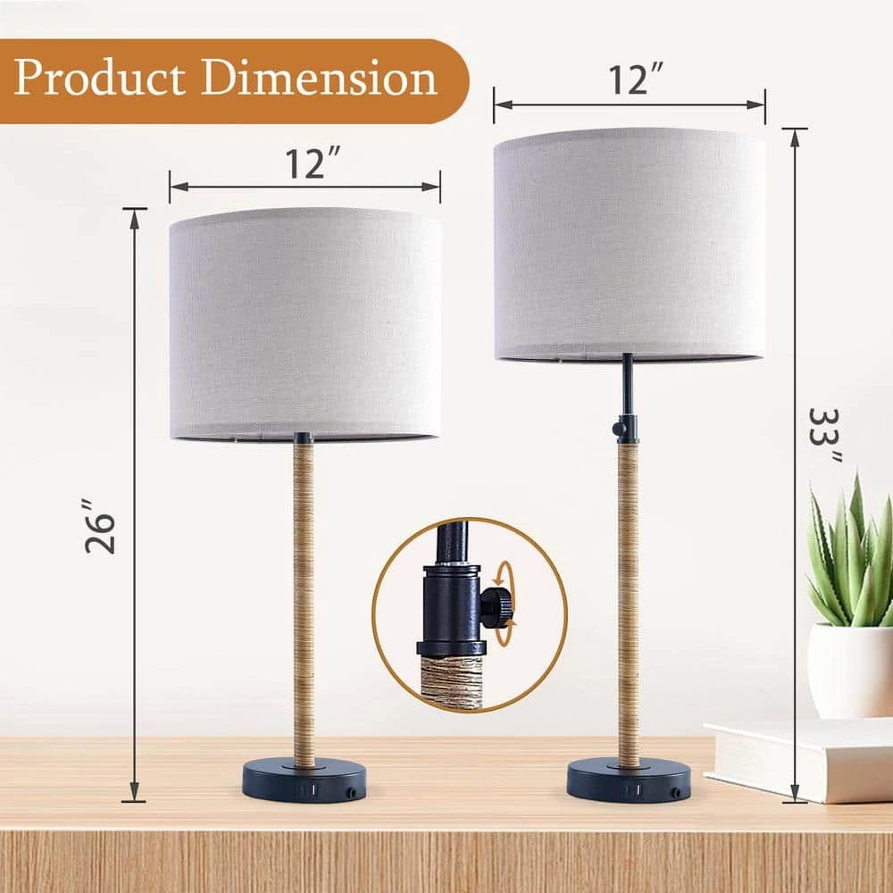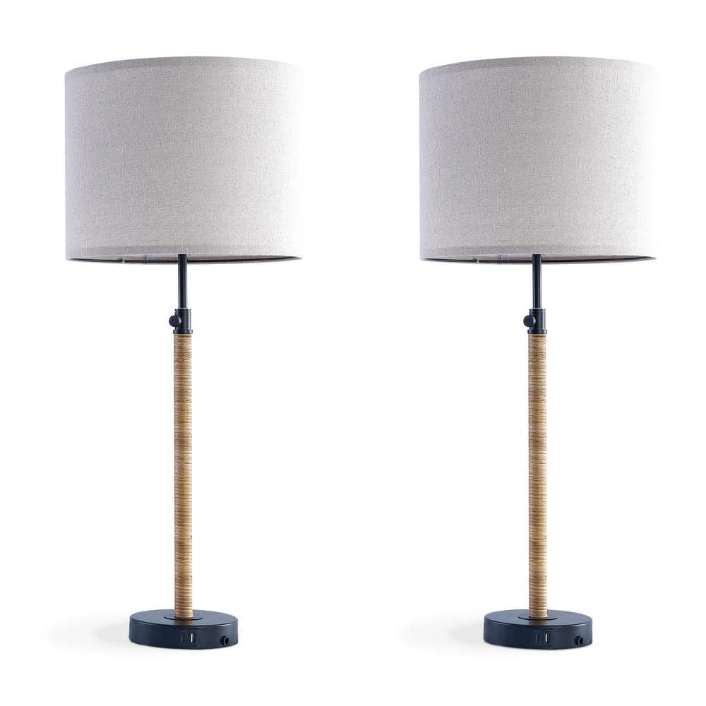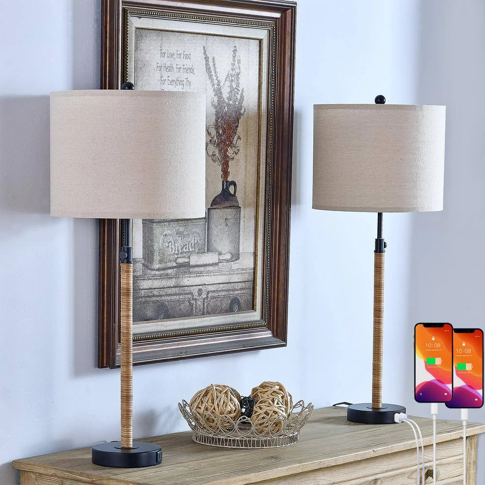 This stylish table lamp combines black metal with natural rattan elements, showcasing a unique blend of modern and natural styles. Featuring a classic white fabric lampshade, it emits soft lighting to create a warm and cozy atmosphere. The lamp has an adjustable height for added convenience and includes built-in USBand Type-C ports, allowing you to charge your phone, iPad, Bluetooth headphones, and other electronic devices anytime.