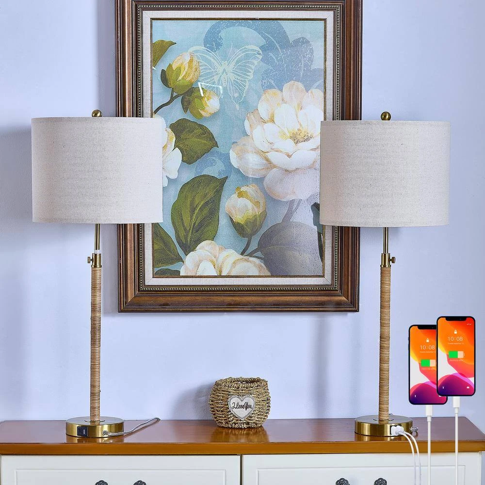 This stylish table lamp combines brass and natural rattan elements, showcasing a unique blend of modern and natural styles. Featuring a classic white fabric lampshade, it emits a soft light that creates a warm and cozy atmosphere. The lamp is height-adjustable for added convenience and is equipped with built-in USBand Type-C ports, allowing you to charge your phone, iPad, Bluetooth earbuds, and other electronic devices at any time.