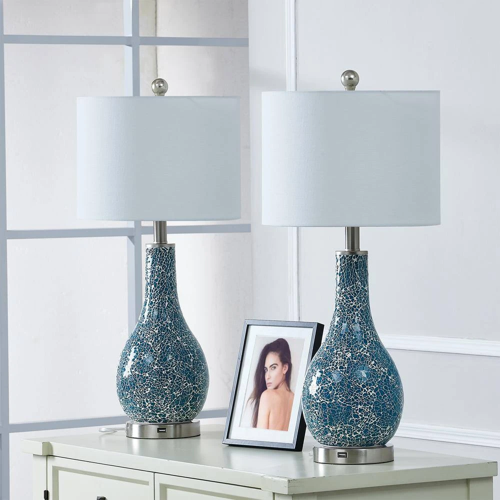 This 2-piece set of bedside table lamps light up your space with fun texture and boho flair. Both are crafted in teardrop shapes with a unique crackled effect that reminds us of mercury glass. The circular metal bases have built-in USB ports ideal for charging your phone or tablet while you’re reading or watching TV. The simple drum shade and finial top allows the body of the lamp to really shine (literally). Each lamp takes 1 standard bulb (sold separately).